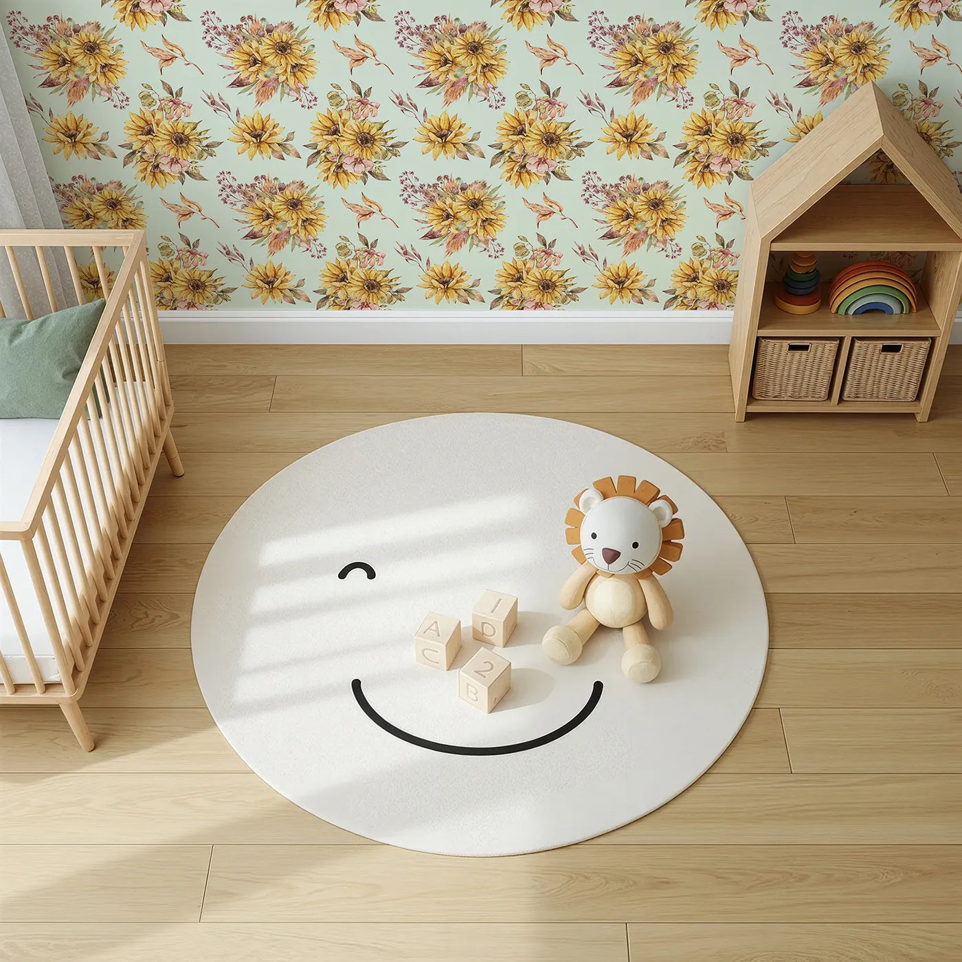 This charming floral wallpaper fills the room with the cheerful energy of a sun-kissed meadow on a fresh mint green background. Featuring beautiful bouquets of watercolor sunflowers and delicate botanicals, it creates a cozy and inviting atmosphere. Itβs a perfect design for a bright and happy nursery.