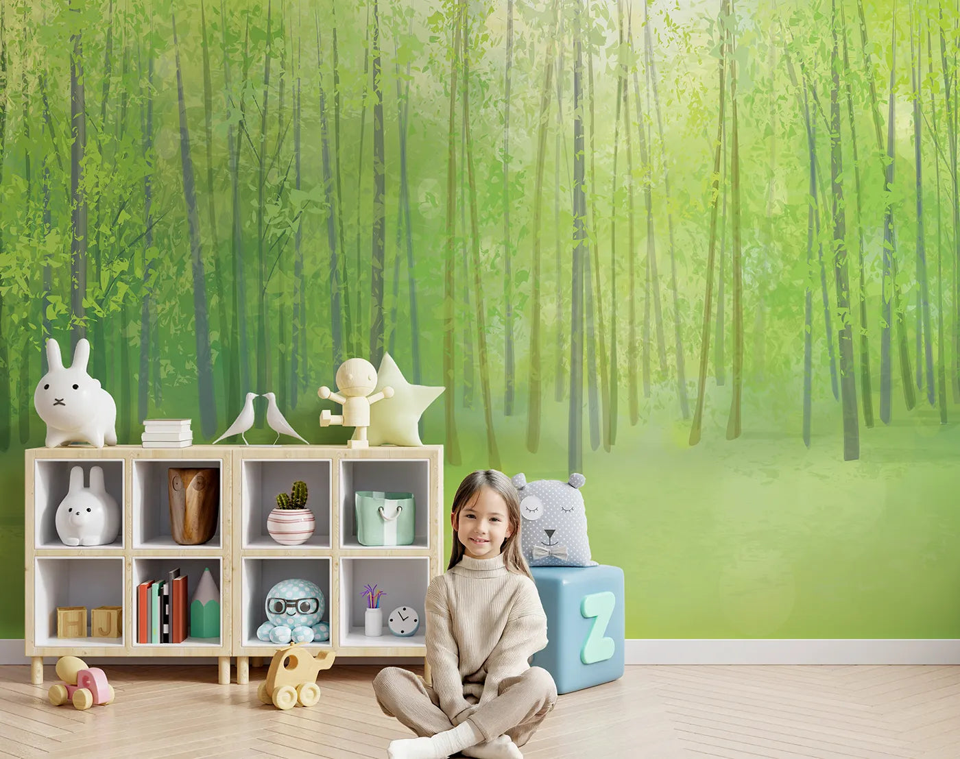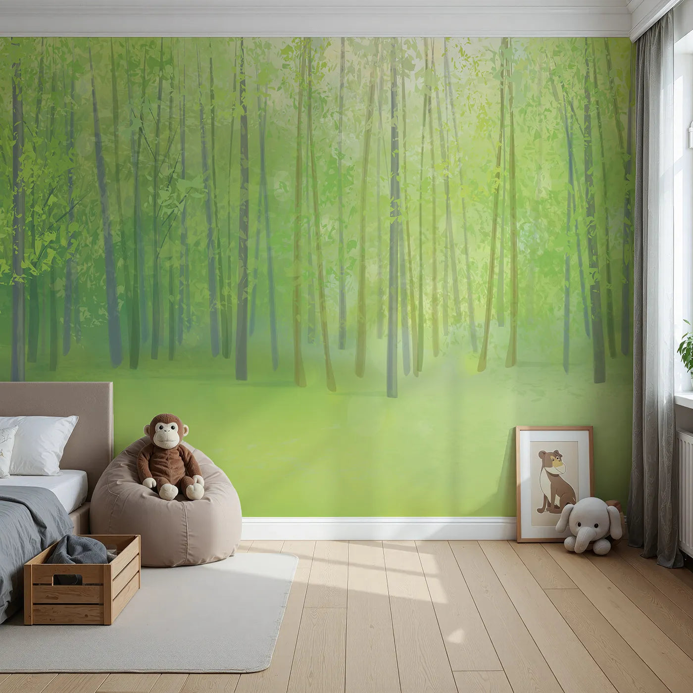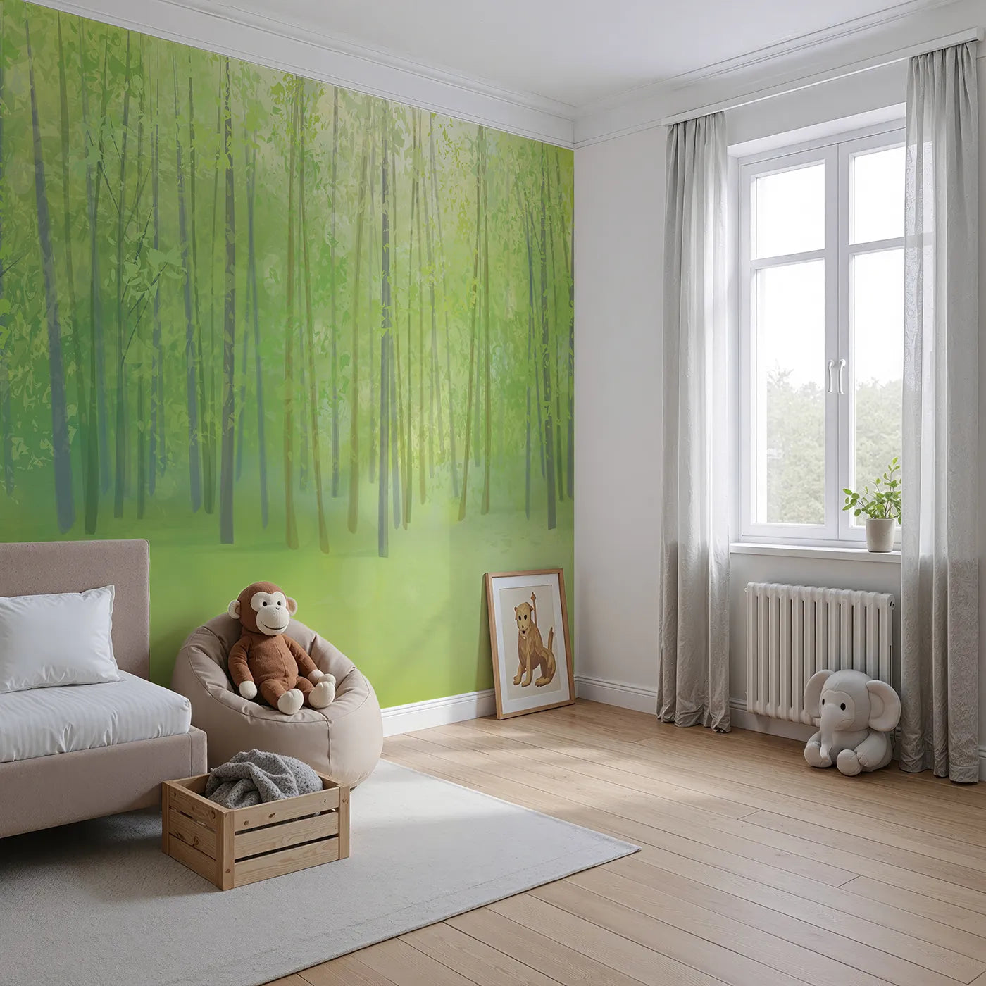 This vibrant forest wall mural fills any room with the cheerful feeling of a perfect spring day. Bright, sunlit leaves create a dense canopy of green, making you feel like you're standing in a peaceful, sun-dappled clearing. It's a refreshing and joyful piece of nature decor.