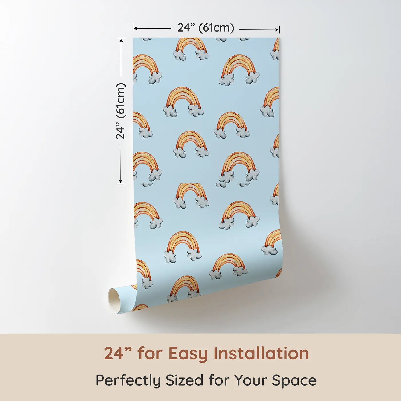 Let them drift off to sleep surrounded by the calming magic of this rainbow wallpaper. A pattern of sweet sunset-hued rainbows is scattered across a peaceful sky-blue background, creating a serene and imaginative scene that feels both modern and sweet.