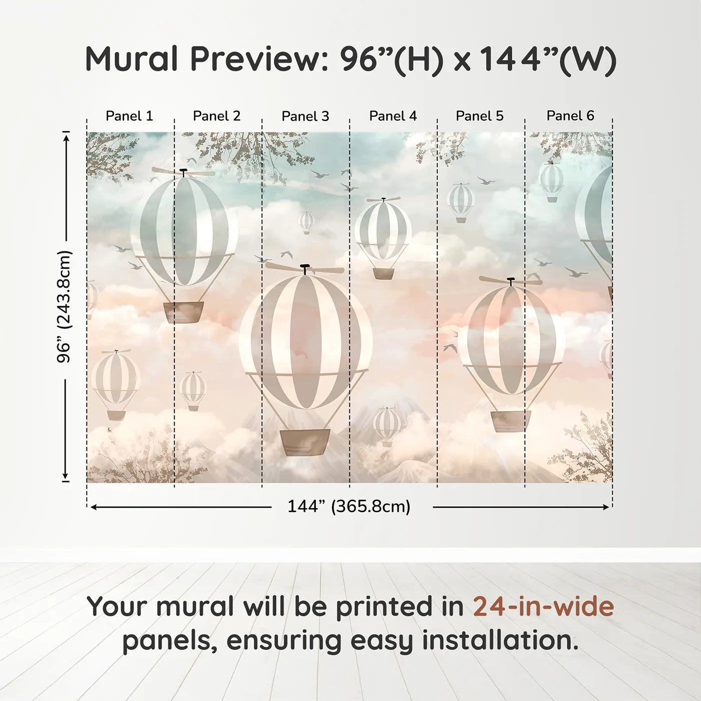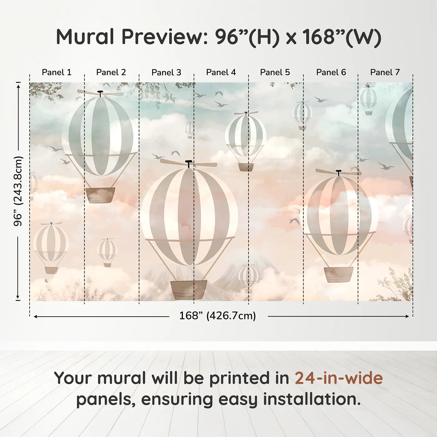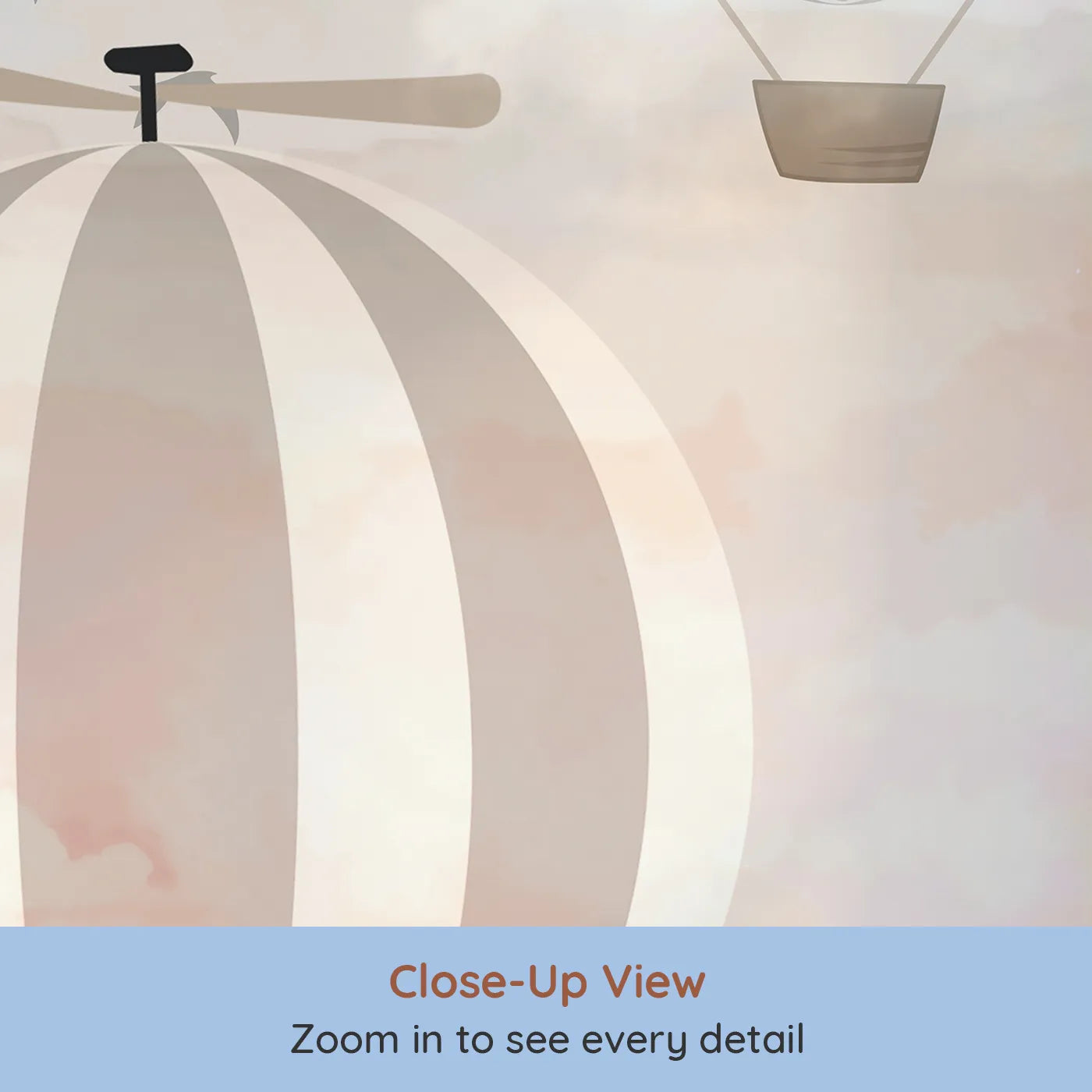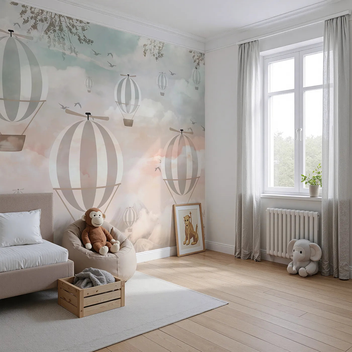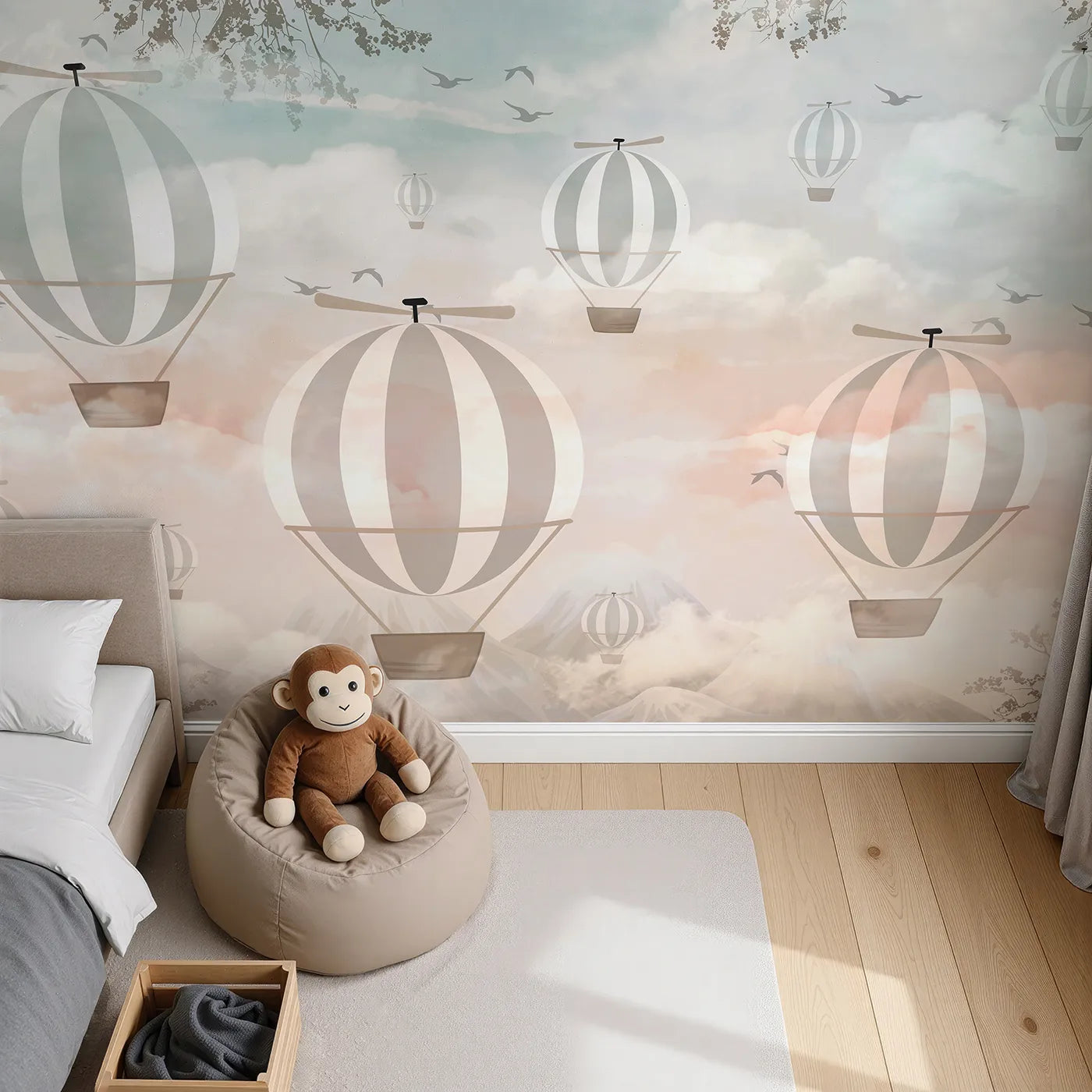 This beautiful and calming wall mural features a collection of vintage hot air balloons and biplanes flying through a misty, sunset-hued sky. The soft, warm colors and classic design create a timeless and magical feel, perfect for a soothing, modern nursery or child's bedroom.