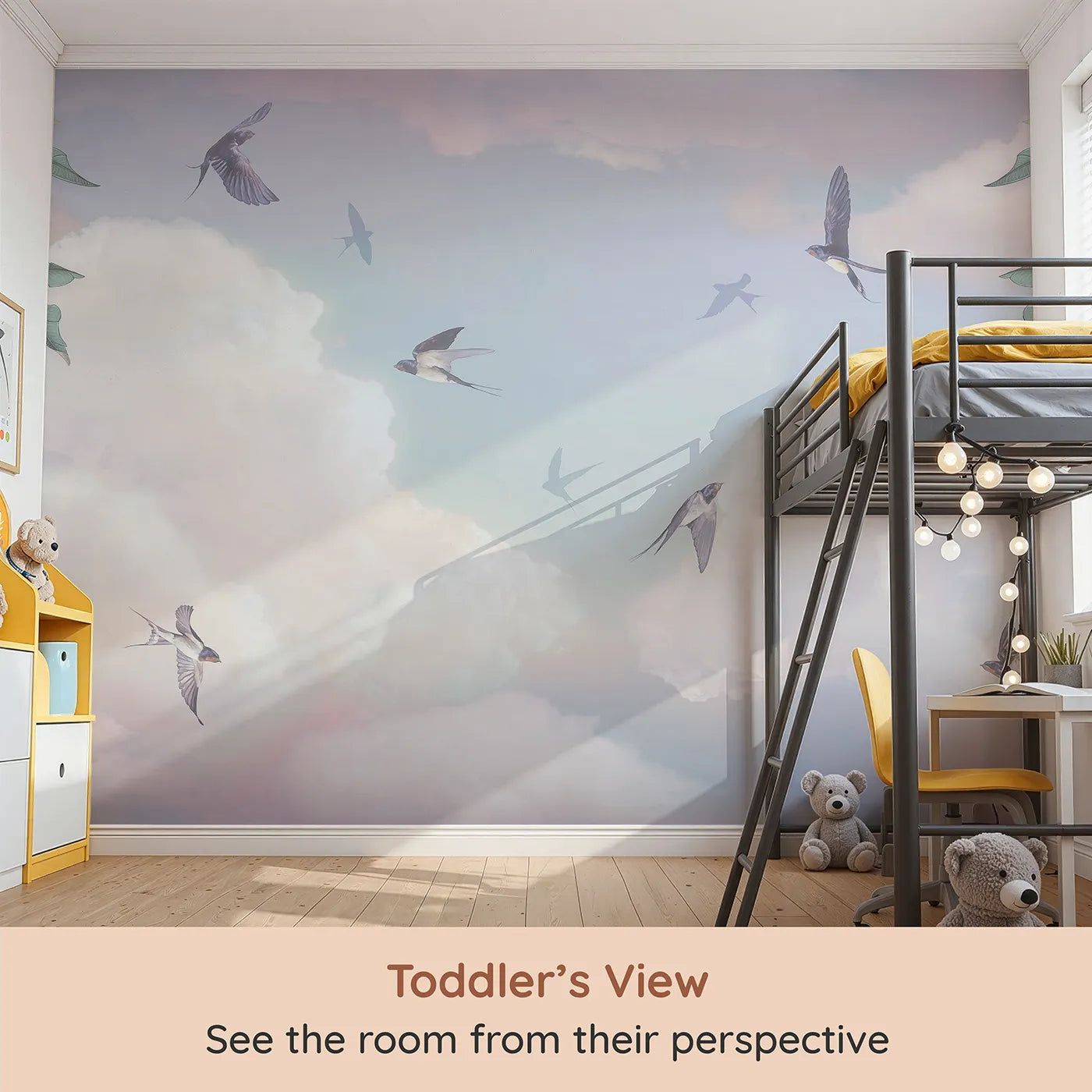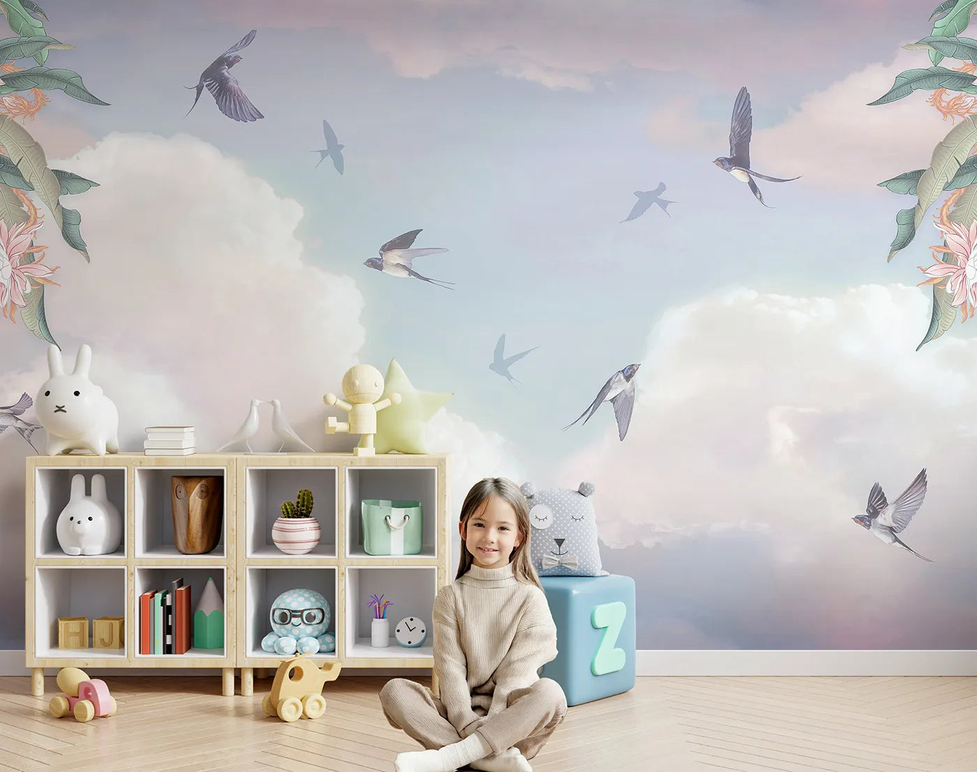 This beautiful wall mural creates a perfectly serene and dreamy atmosphere for a nursery or child's room. Graceful swallows soar through a sky of soft, fluffy clouds painted in gentle pastel tones. The corner floral elements add a touch of classic, romantic charm.