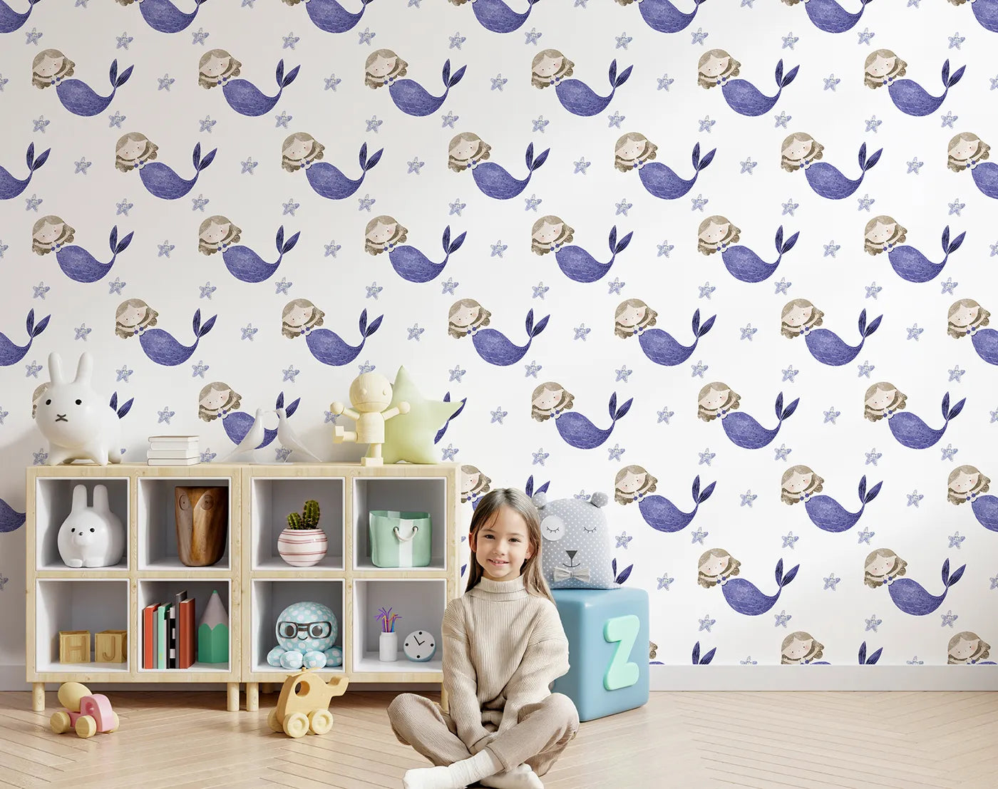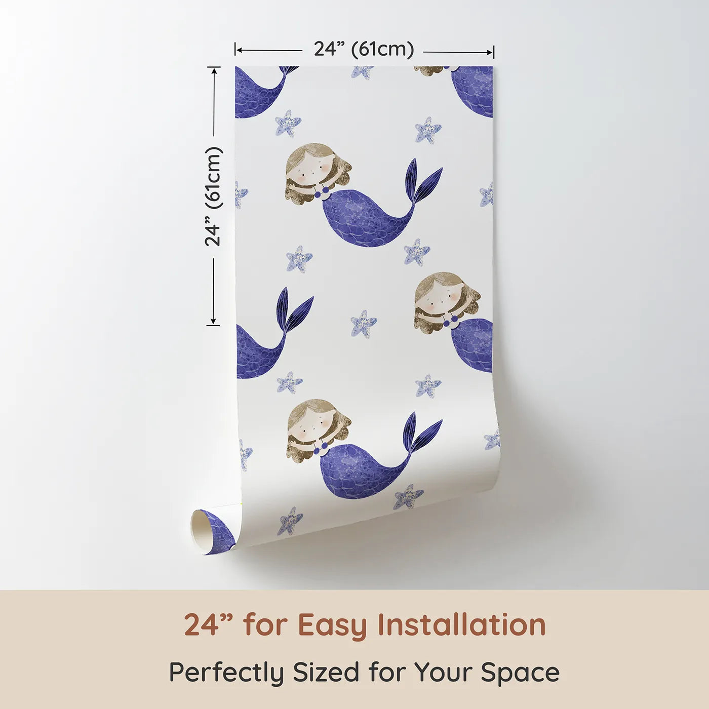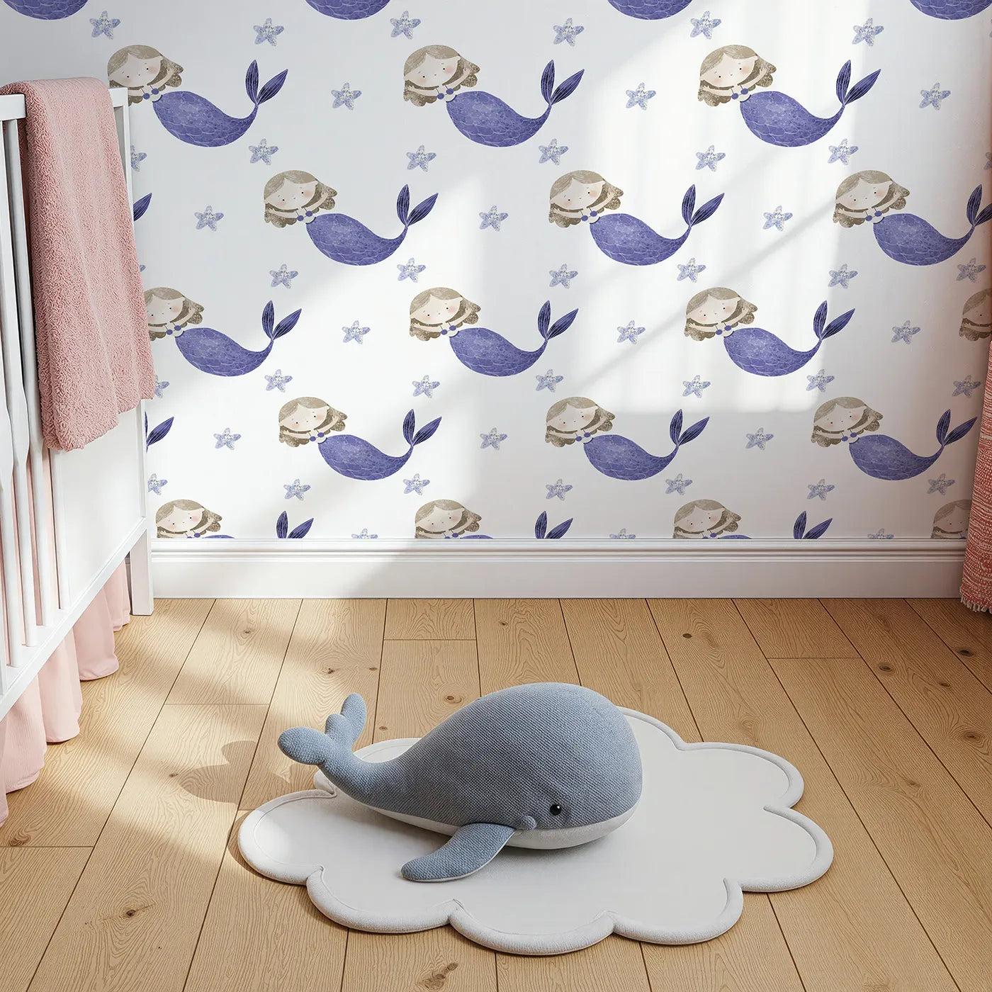This enchanting mermaid wallpaper brings a touch of artistic magic to your little one's room. A sweet mermaid with a beautiful textured tail in shades of purple swims among little watercolor starfish. The dreamy, hand-painted style creates a whimsical and serene atmosphere perfect for a girl's bedroom or a magical reading nook.