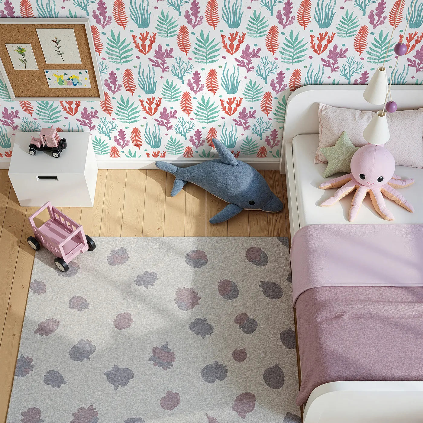 This vibrant ocean wallpaper is like a dive into a colorful underwater forest. A beautiful pattern of textured seaweed in shades of pink, red, and teal creates a lively and artistic look. The rich colors and unique textures are perfect for a fun kids' bathroom or a bold, imaginative playroom.