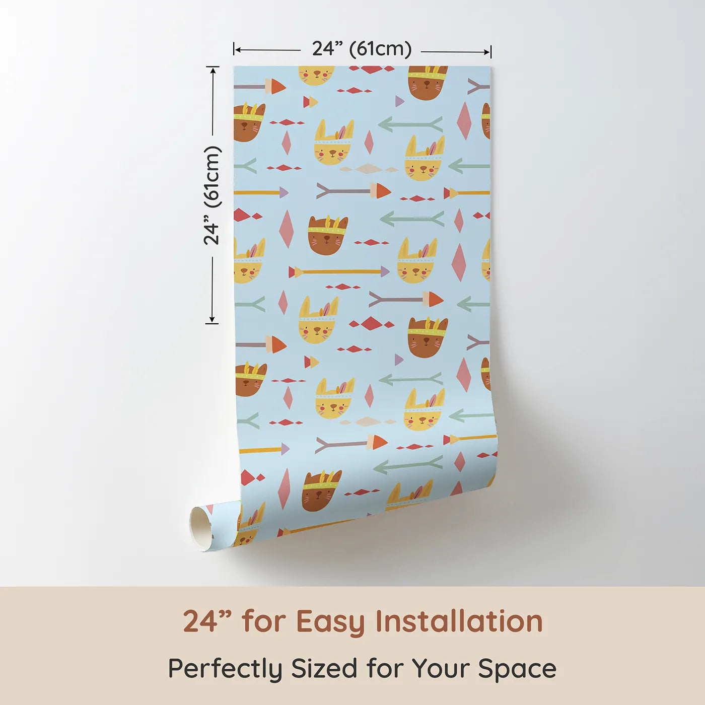 This charming nursery wallpaper features a parade of sweet bunnies and bears wearing tribal-inspired headbands. Mixed with arrows and geometric shapes on a calm sky blue background, this design creates a playful and imaginative space for your little one to dream and grow.