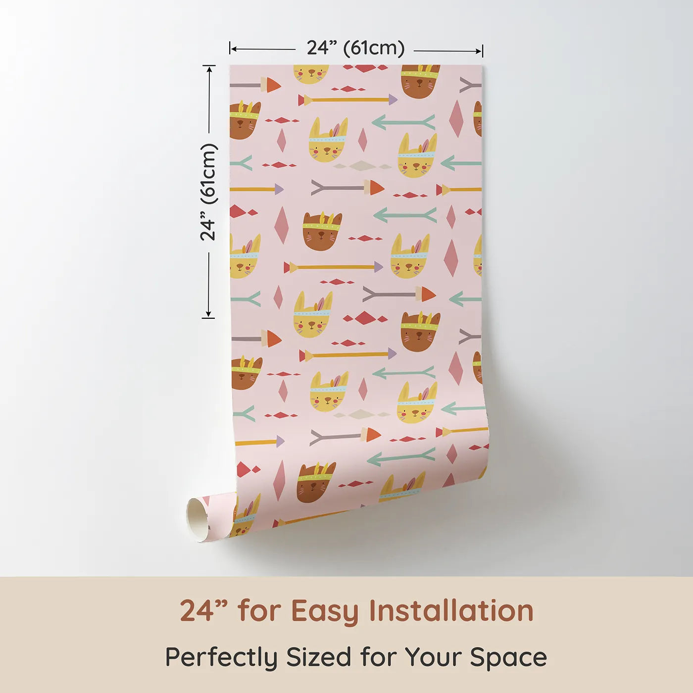 This charming girls wallpaper features a parade of sweet bunnies and bears wearing tribal-inspired headbands. Mixed with arrows and geometric shapes on a petal blush pink background, this design creates a playful and imaginative space for your little one to dream and grow.