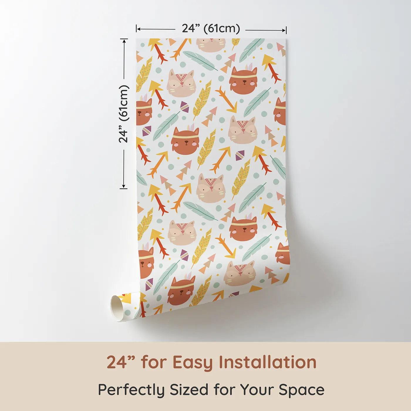 This charming animal wallpaper features a pattern of cute kittens with sweet tribal headbands and markings. Set against a soft white background with playful dots and arrows, this design is perfect for creating a fun and modern playroom or a stylish nursery for your little one. It's a whimsical take on a favorite pet.