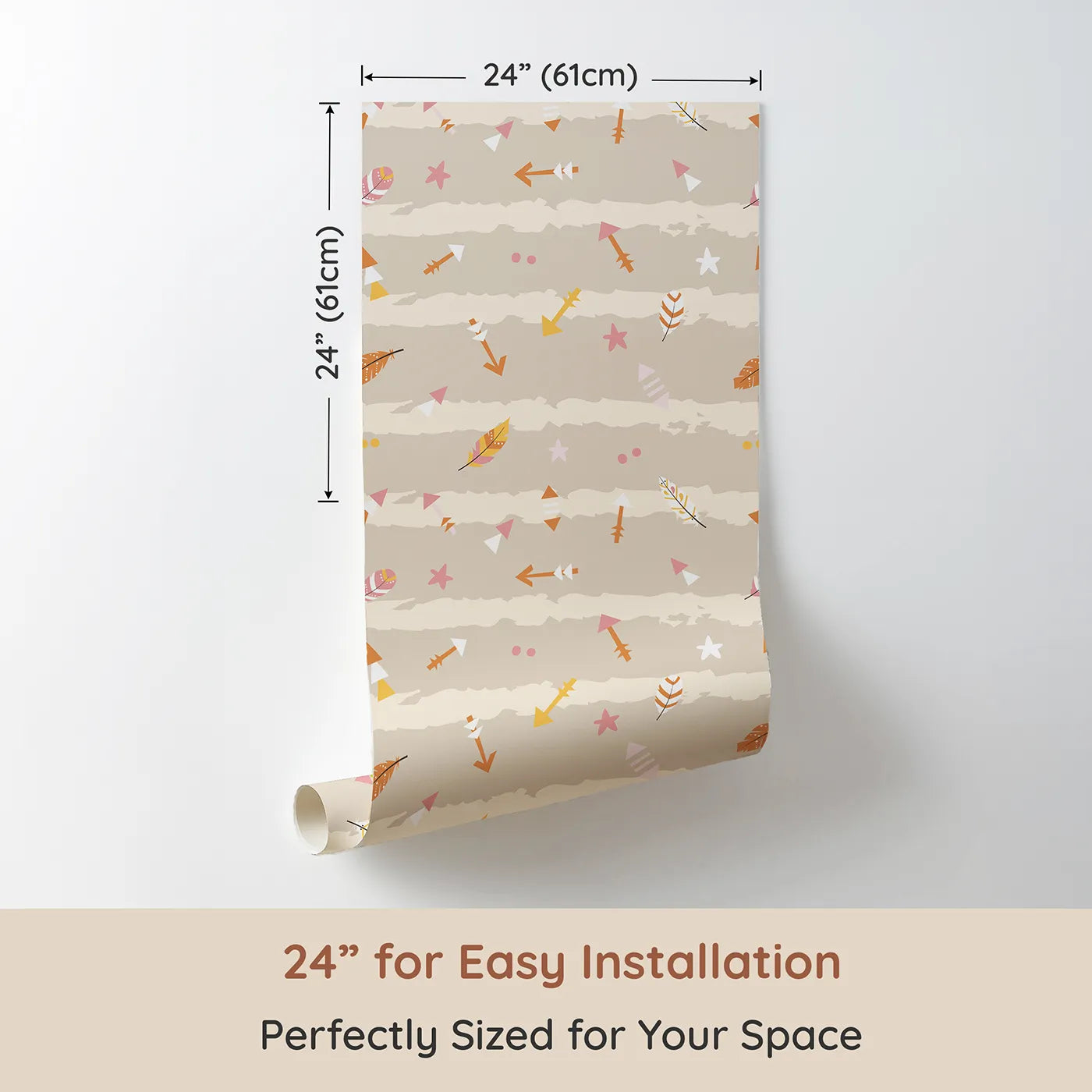 This charming nursery wallpaper creates a warm and serene atmosphere with its pattern of boho feathers, arrows, and stars. Set against a soft beige striped background, this gender-neutral design is perfect for a modern, calming space. The earthy tones are both stylish and timeless.