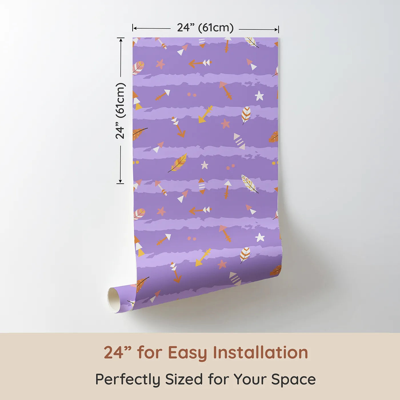 This enchanting wallpaper for girls features a whimsical dance of boho feathers, arrows, and stars on a dreamy lavender striped background. The soft pastel palette creates a calming and magical atmosphere, perfect for a nursery or a little girl's bedroom, inviting sweet dreams and imaginative thoughts.