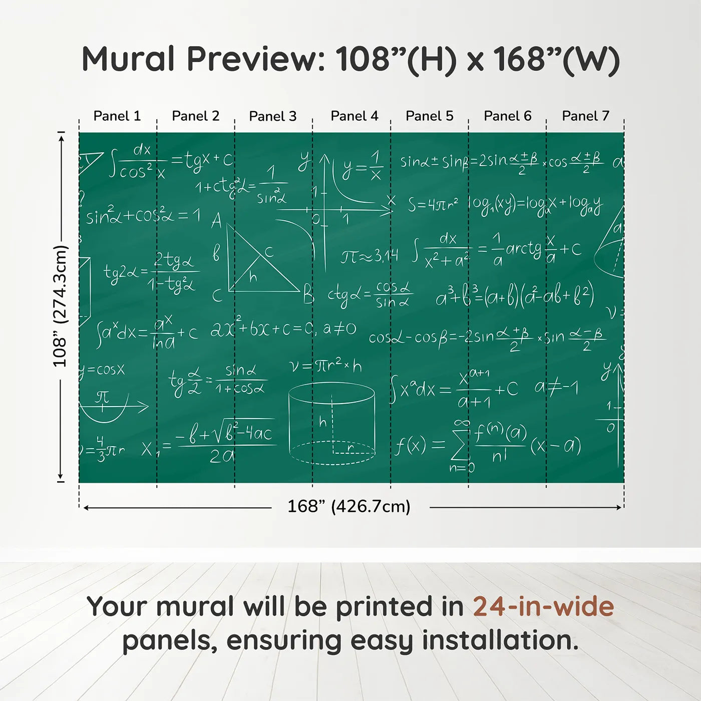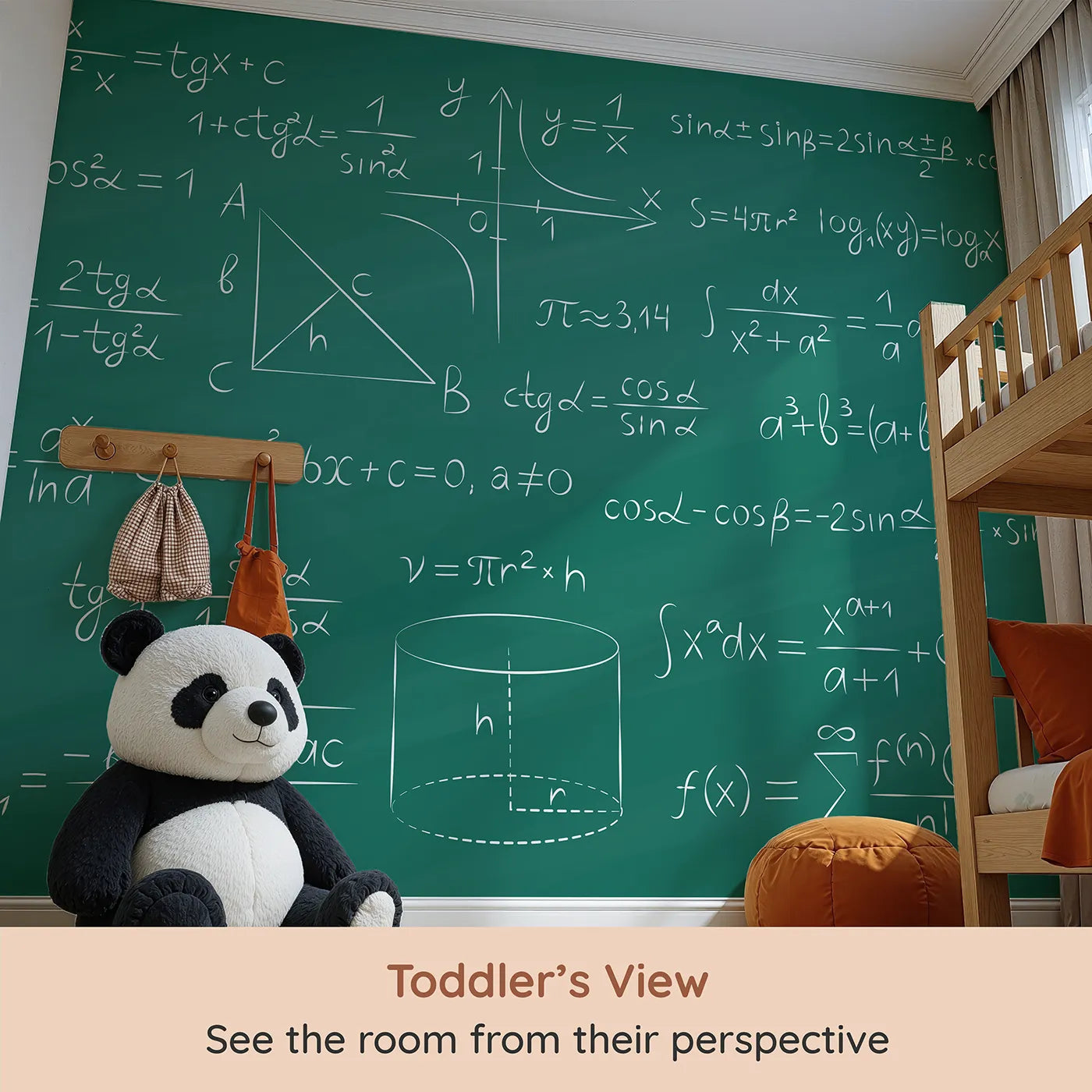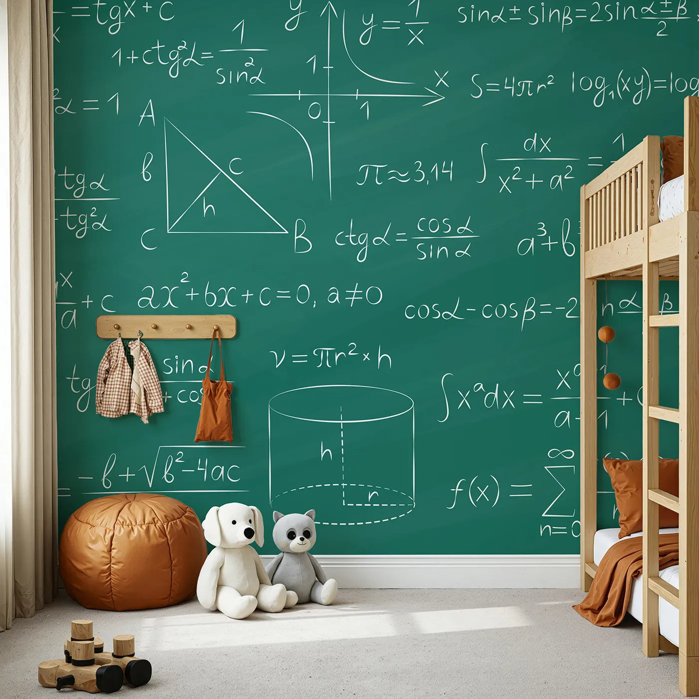 This smart and stylish wall mural features a collage of trigonometry formulas and geometric diagrams on a classic green chalkboard background. It's the perfect choice for a big kid's room, study space, or a STEM-themed playroom, making learning look cool.