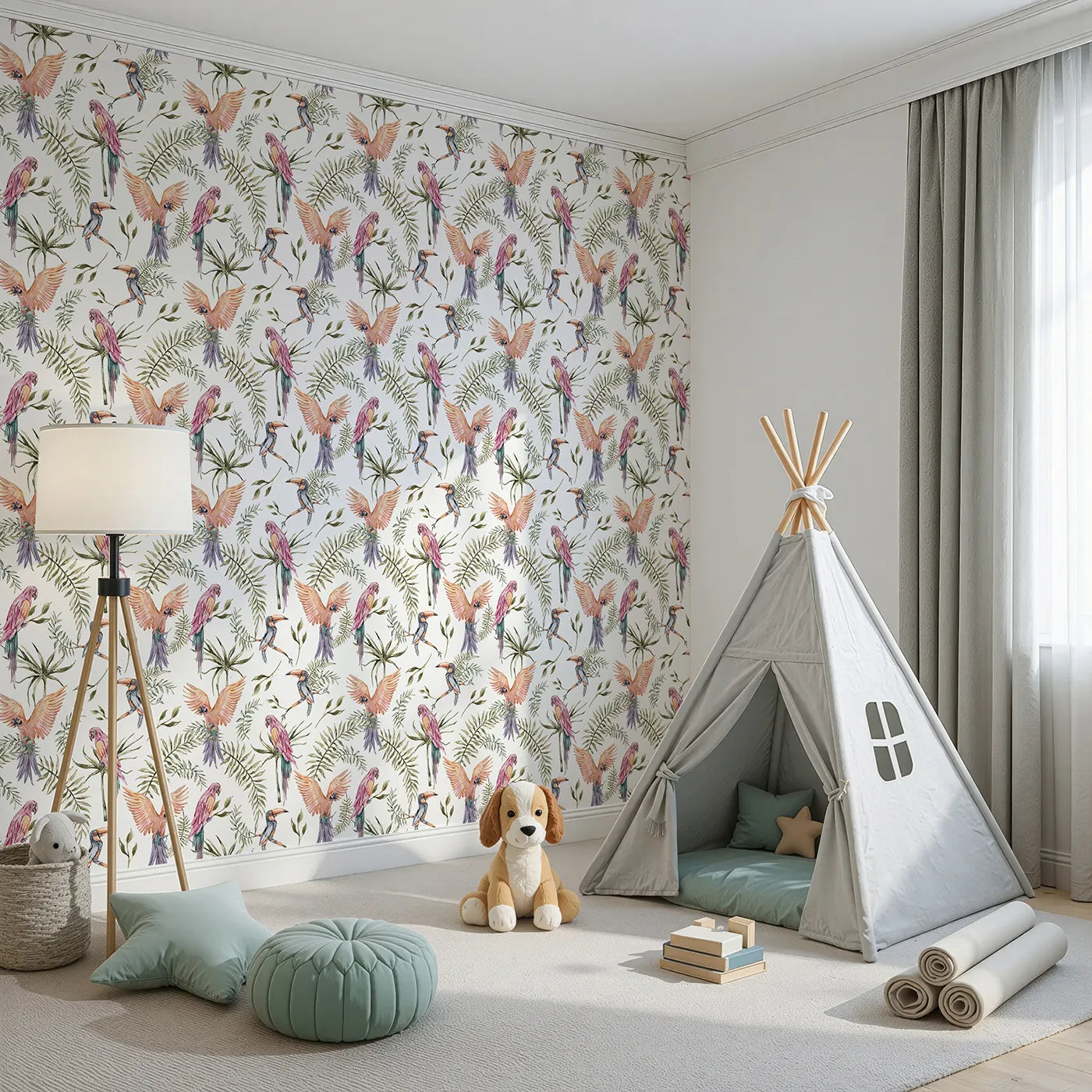 This fun jungle wallpaper is bursting with life! Colorful parrots and toucans with bright, watercolor wings are perched among lush green tropical leaves. The lively design on a clean white background creates an energetic and imaginative space perfect for any little explorer's bedroom or playroom.