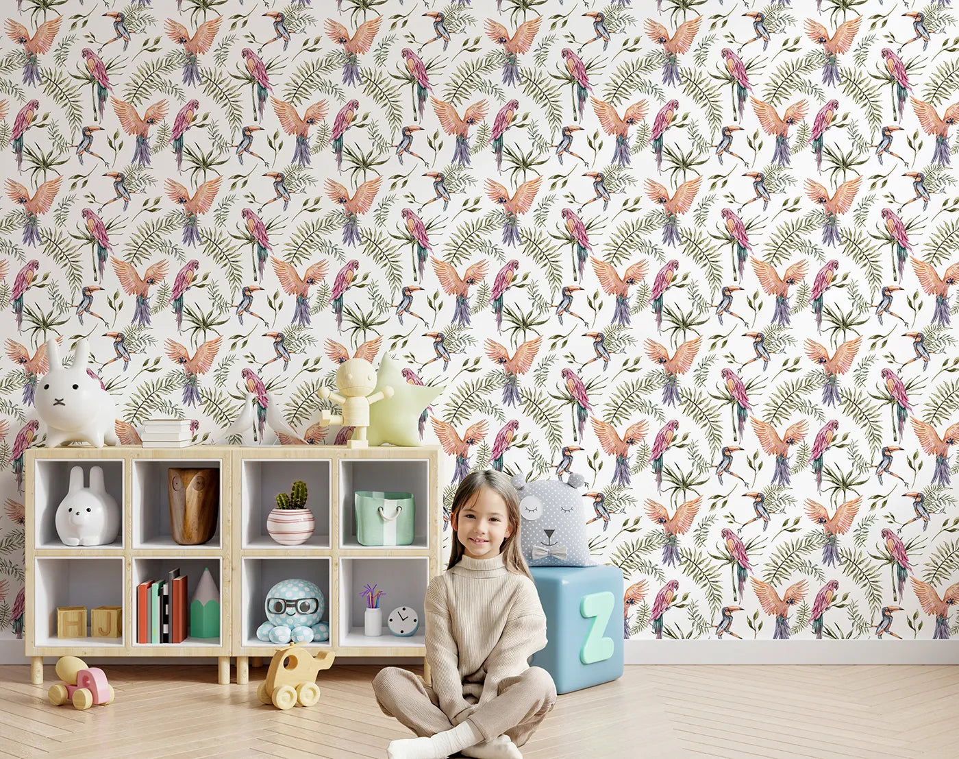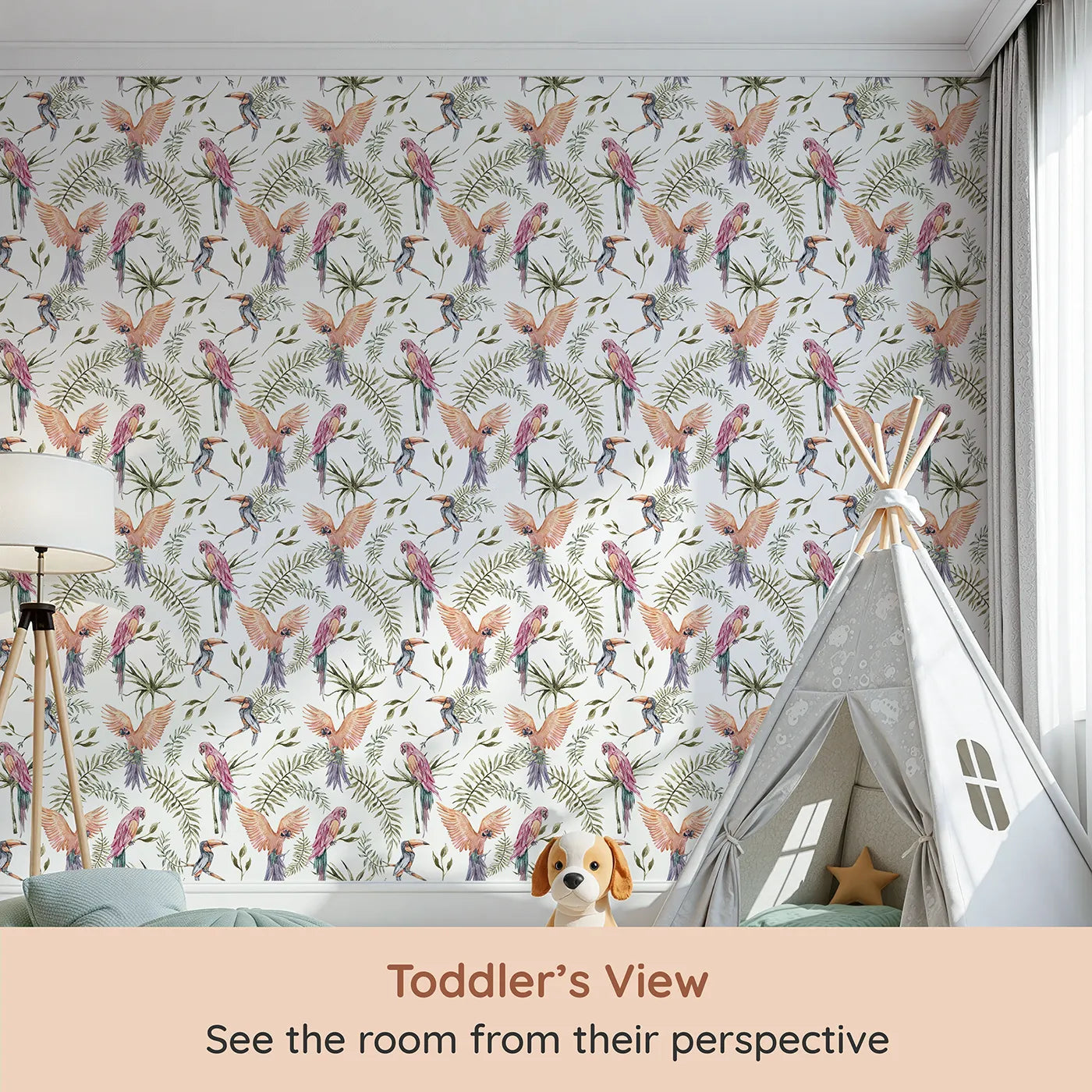 Let their imagination take flight with these beautiful birds, sparking stories of faraway lands and jungle adventures. Our peel and stick wallpaper is a renter-friendly, easy-install option for busy families. All our wallpapers are printed with GREENGUARD Gold Certified inks.