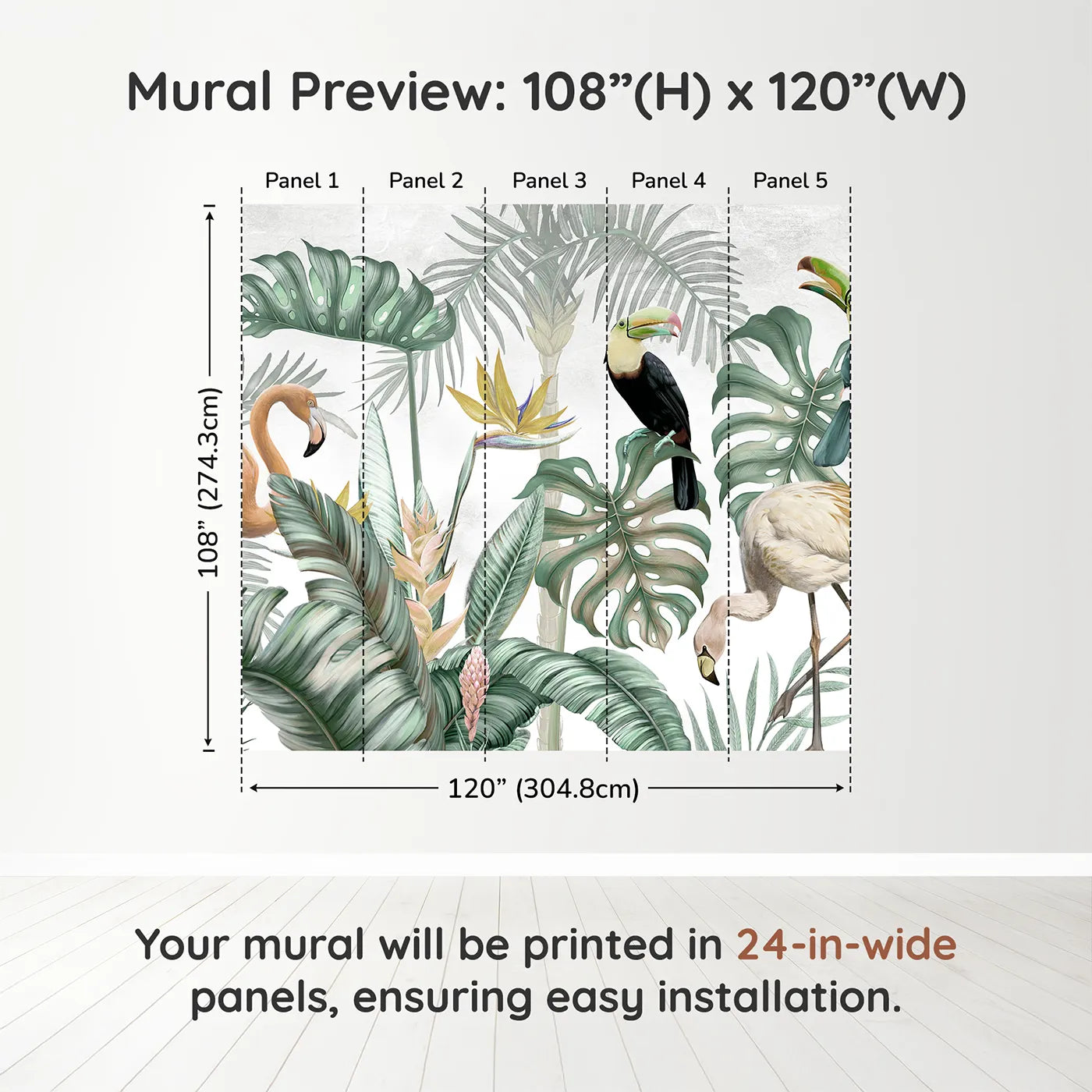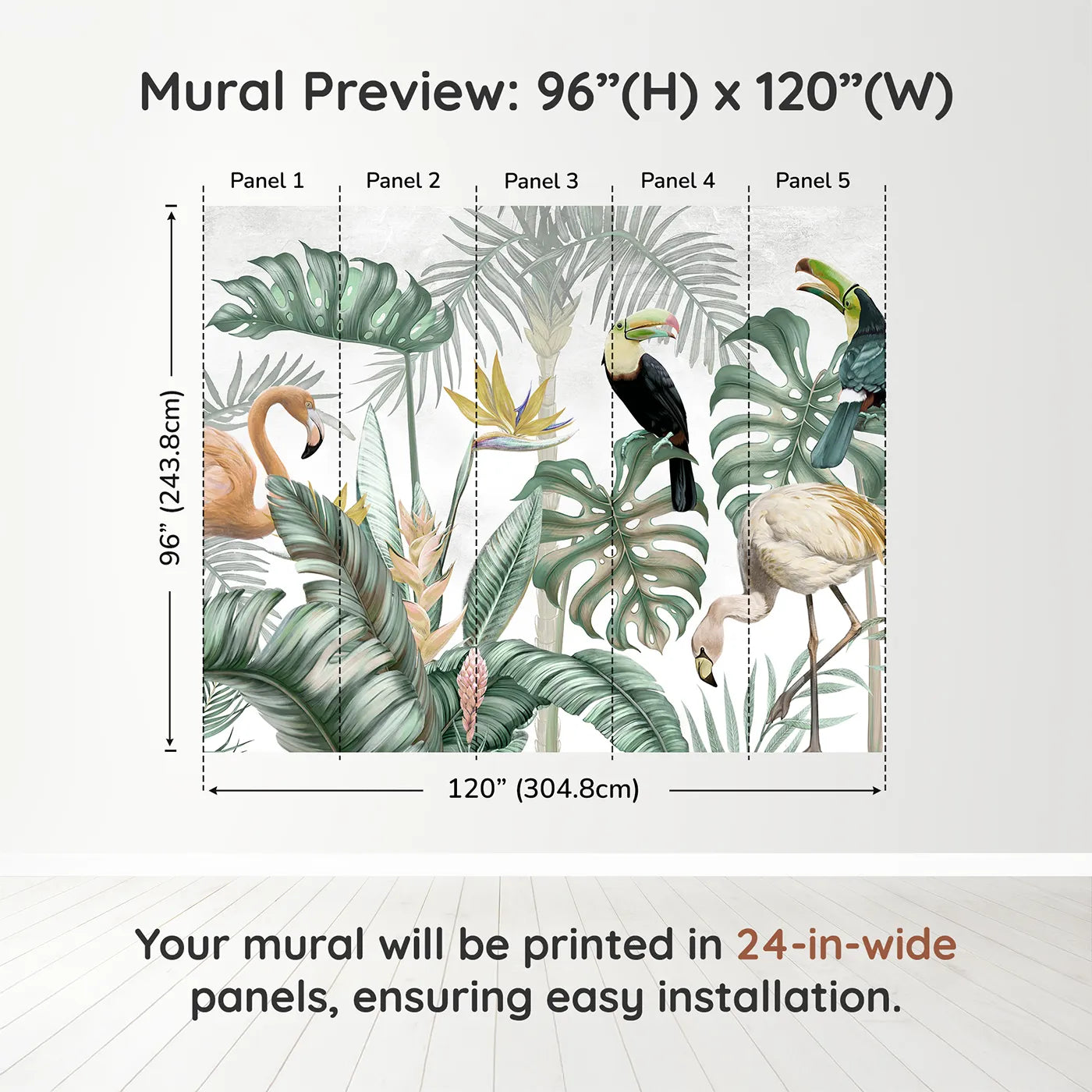 This stunning wall mural transforms any room into a vibrant, exotic paradise. Colorful birds like toucans and flamingos gather among lush greenery and beautiful flowers. The detailed, realistic art style makes this a timeless and captivating scene.