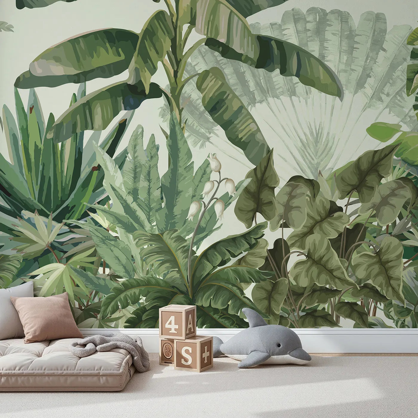 This stunning jungle wall mural brings the deep, lush beauty of a tropical rainforest into their room. Layers of palm trees and jungle foliage in rich shades of green create a dense, atmospheric, and immersive scene. It's a perfect choice for an adventurous child with a love for nature.
