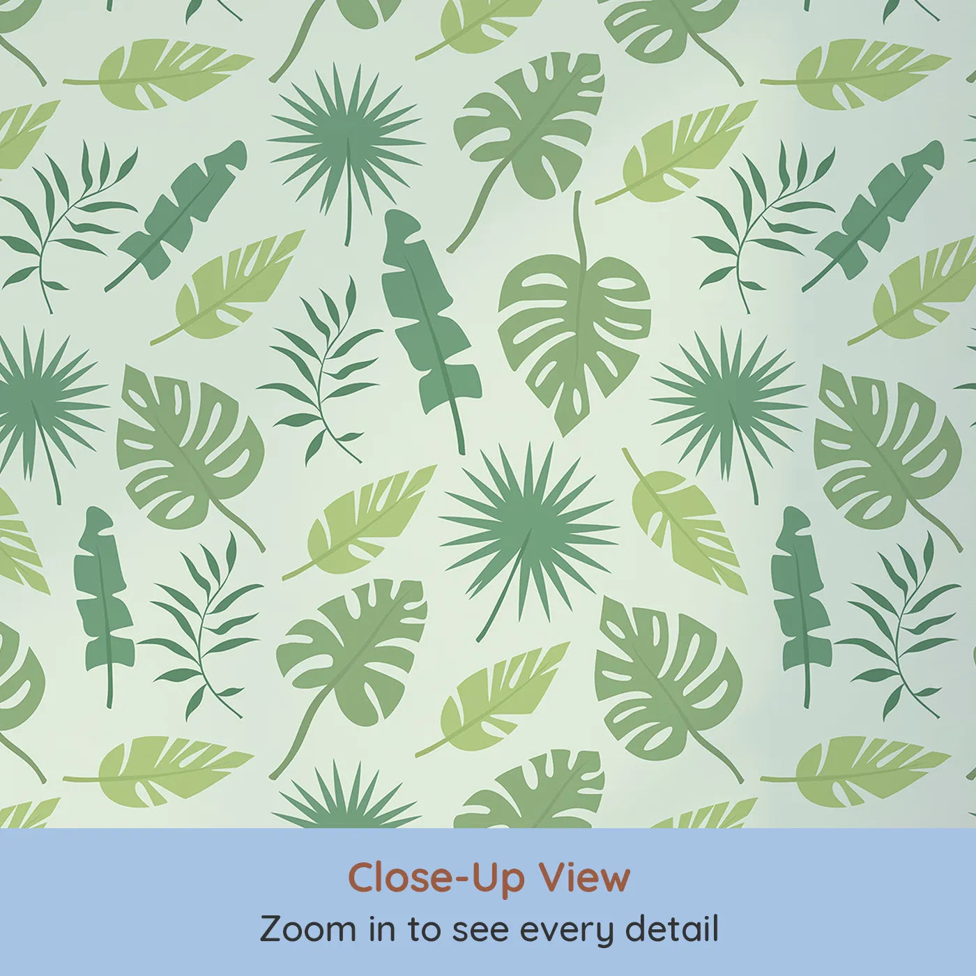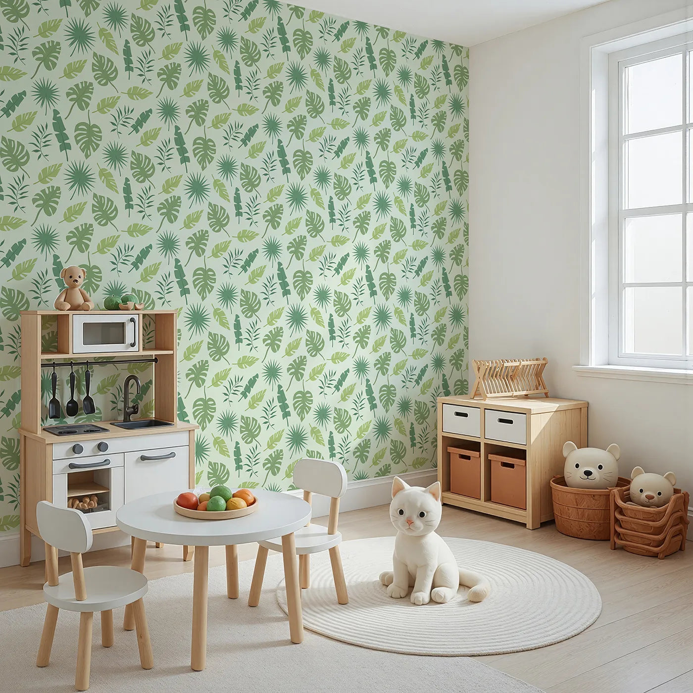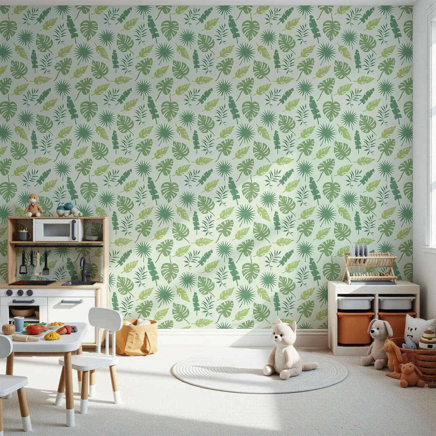 Bring a touch of the calm, gentle jungle into their room with this beautiful botanical wallpaper. Featuring a mix of modern, stylized tropical leaves like monstera and palms in shades of green on a mint background, this design creates a fresh and serene atmosphere.
