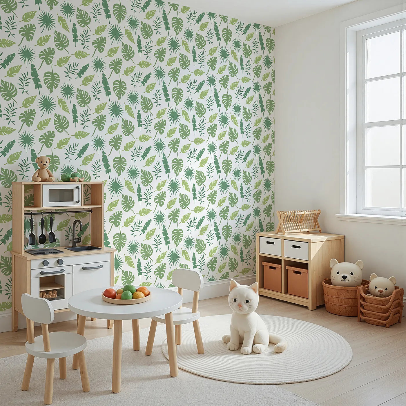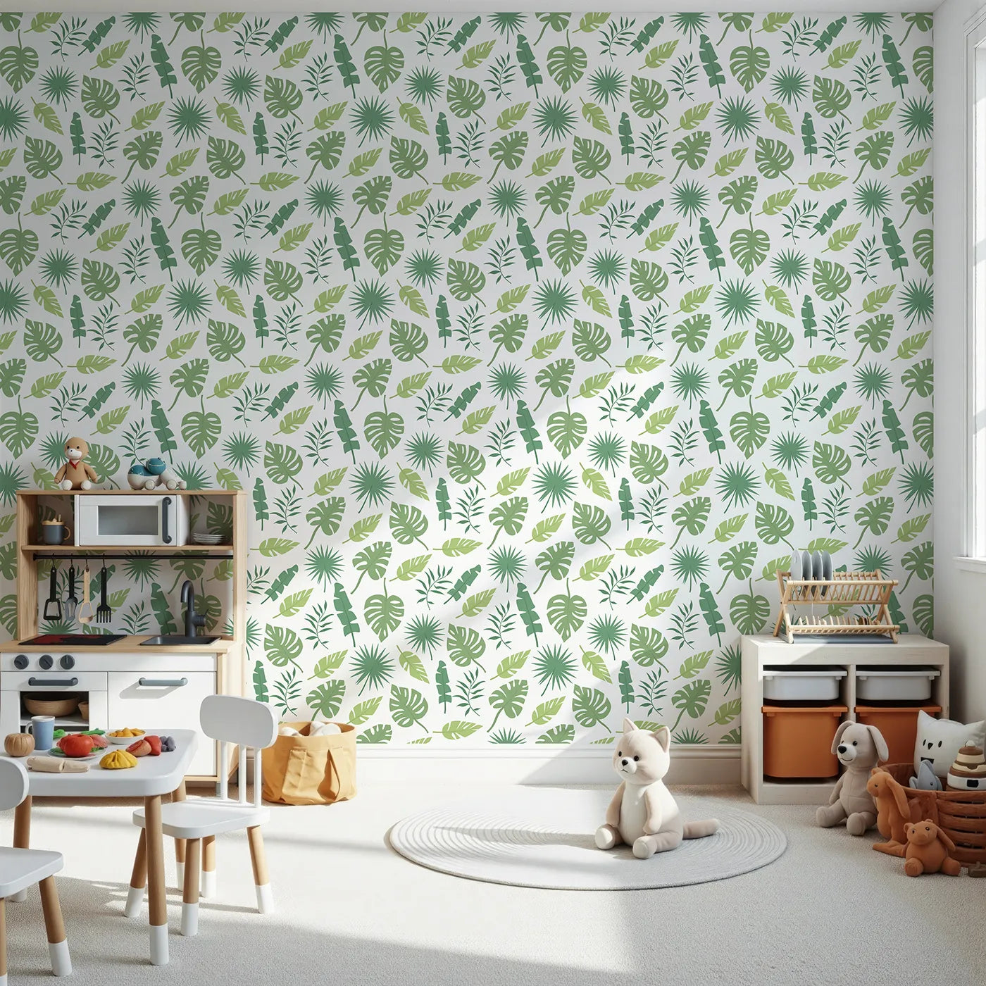 Bring a touch of the calm, gentle jungle into their room with this beautiful botanical wallpaper. Featuring a mix of modern, stylized tropical leaves like monstera and palms in shades of green, this design creates a fresh and serene atmosphere. Itβs perfect for a gender-neutral nursery or a modern kid's room.
