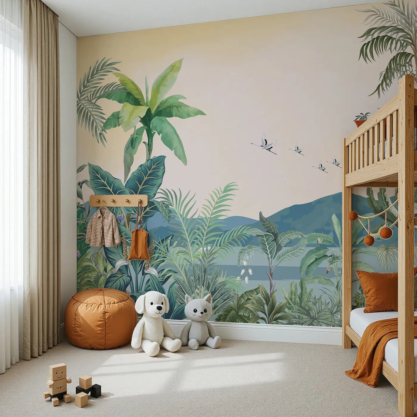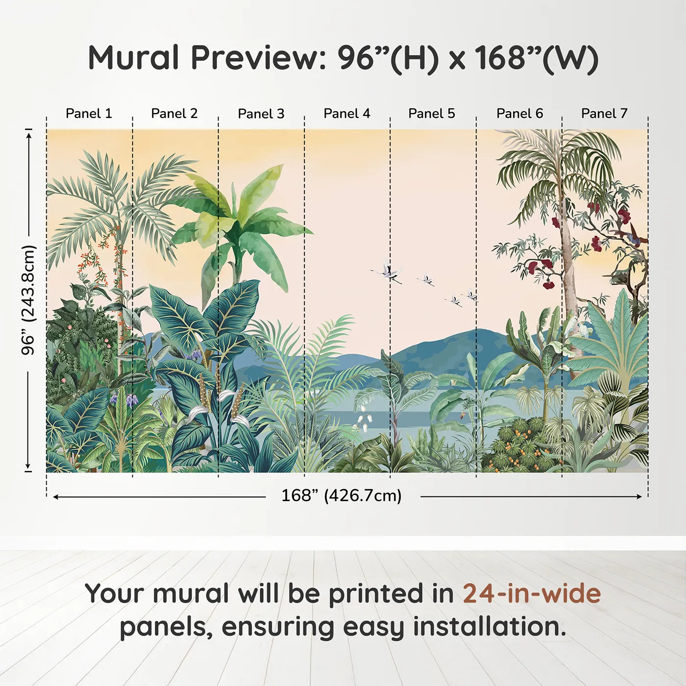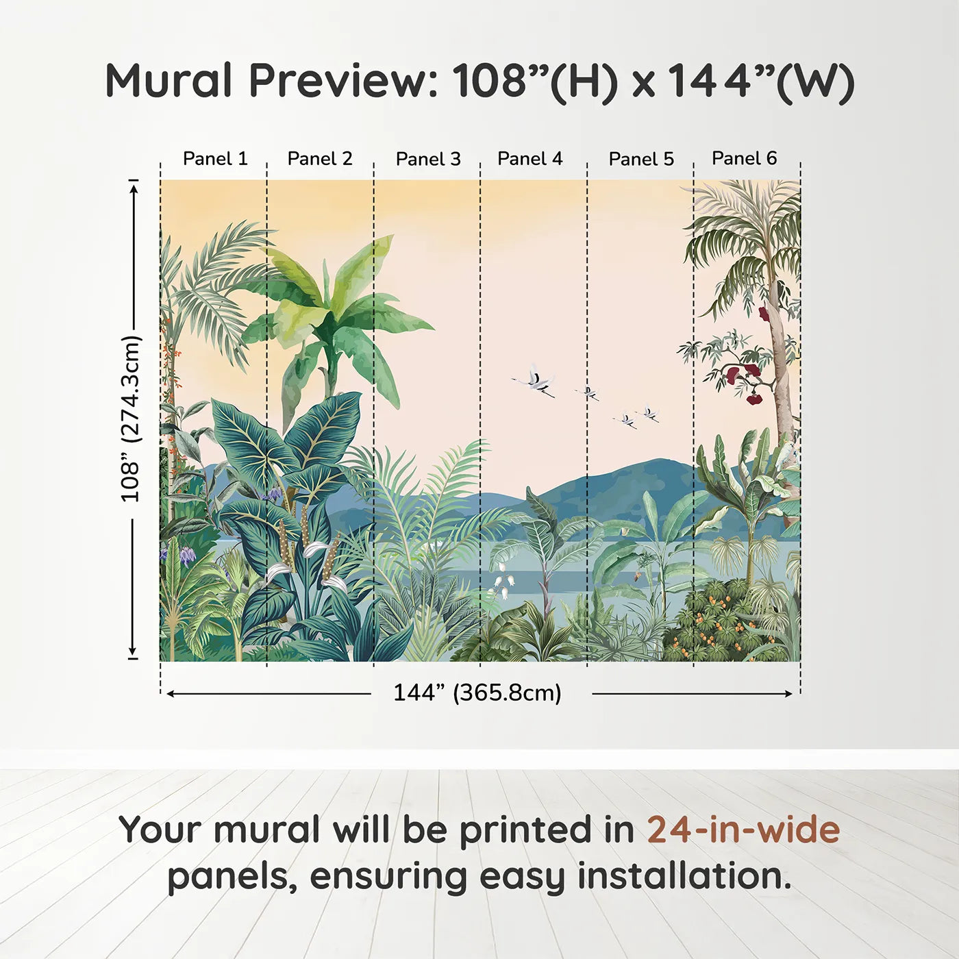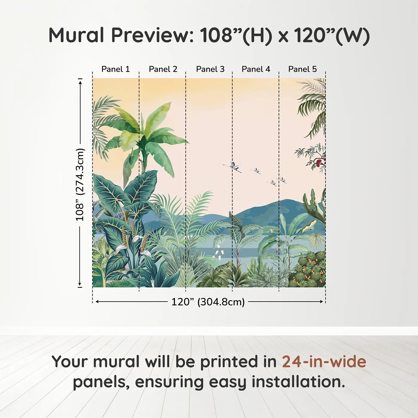This stunning scenic wall mural captures a tropical paradise at sunset. Tall palm trees and lush plants frame a beautiful view of the water, as the sky fills with the warm, golden light of the setting sun. The vintage art style creates a rich and serene atmosphere.
