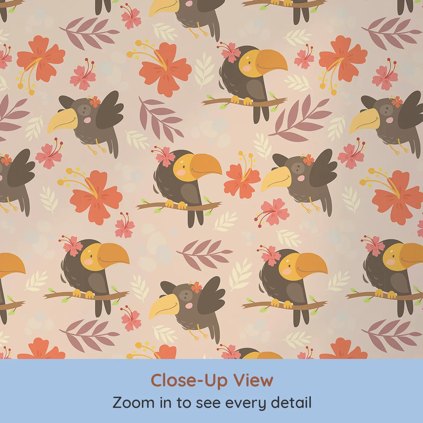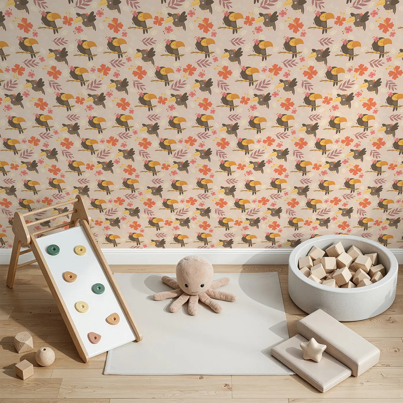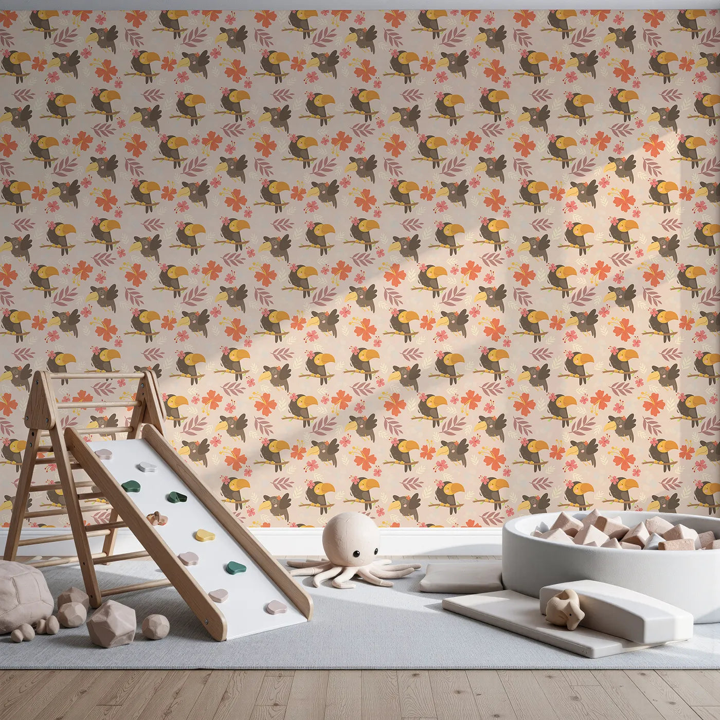 This charming jungle wallpaper features playful toucans perched among bright hibiscus flowers and tropical leaves. The warm and lively design, set on a cream background, is perfect for adding a pop of color and fun to a playroom or a cheerful, gender-neutral nursery for your little explorer.