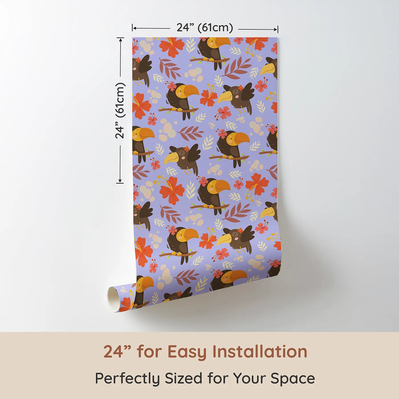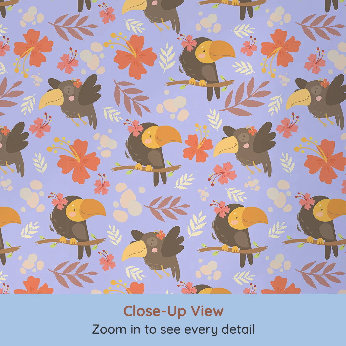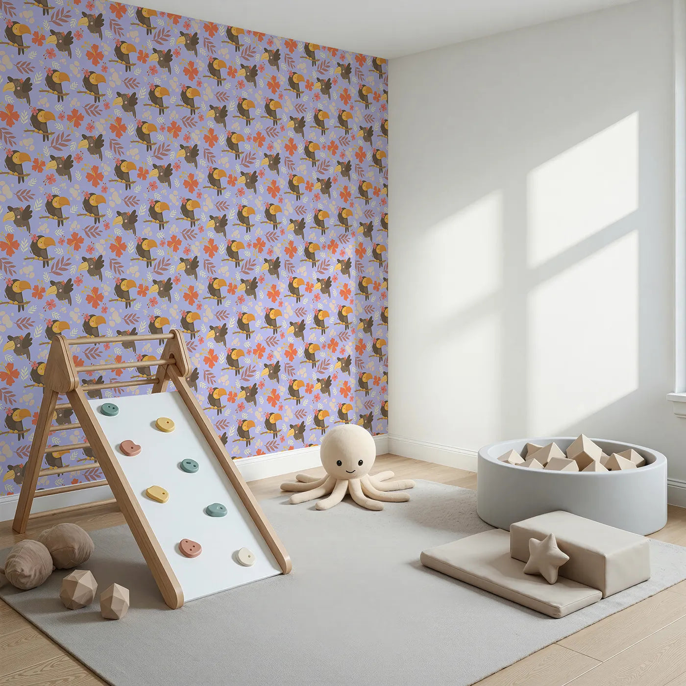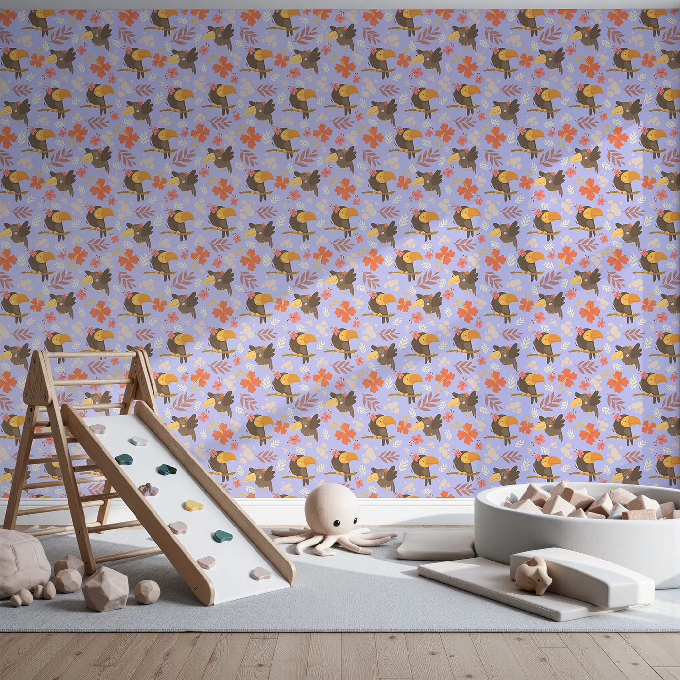 This charming jungle wallpaper features playful toucans perched among bright hibiscus flowers and tropical leaves. The warm and lively design, set on a lavender background, is perfect for adding color and fun to a playroom or a cheerful nursery for your little explorer.