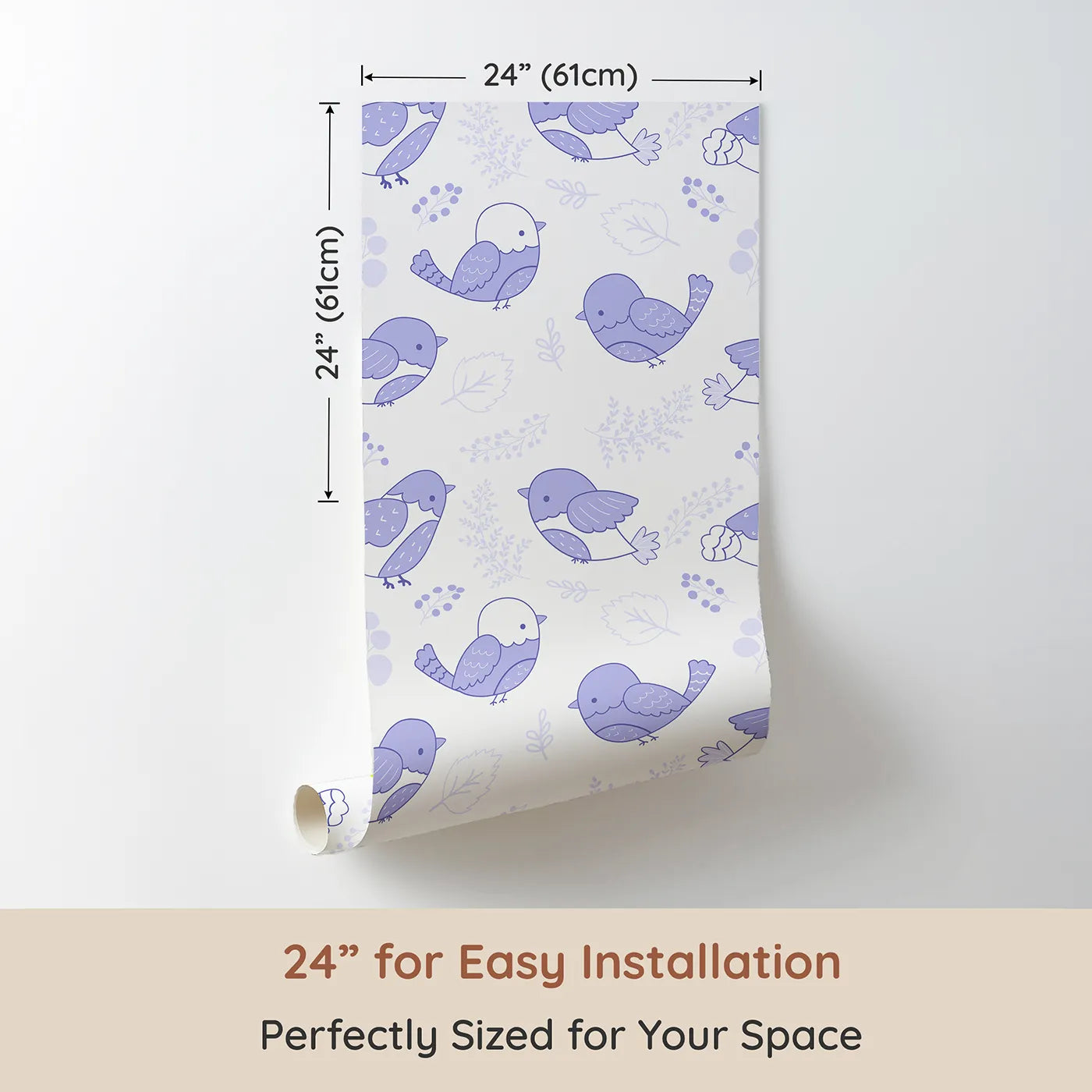 This whimsical girls wallpaper features cute purple birds perched among delicate branches against a clean white background. The magical color and sweet design create an enchanting world, perfect for a nursery or bedroom that inspires fairy tales.