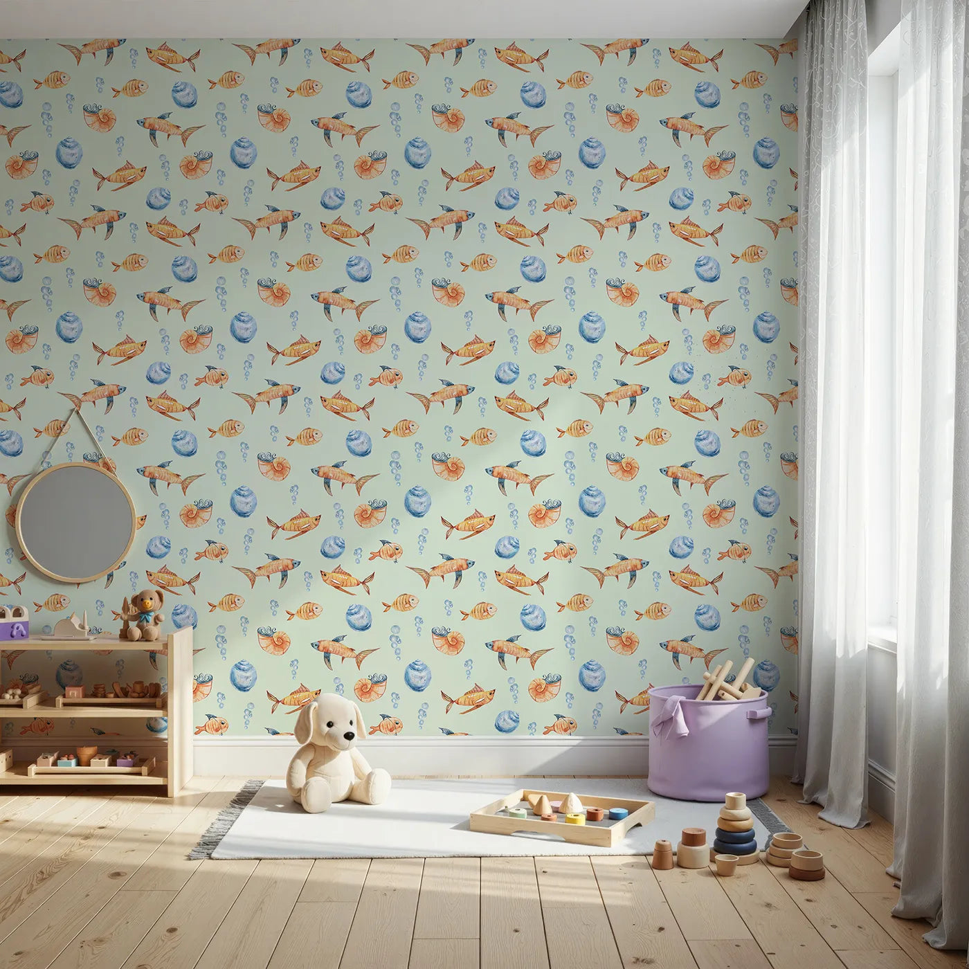 This fun ocean wallpaper brings the bottom of the sea right into their room on a fresh mint green background! It's filled with charming sea creatures like turtles, whales, and fish floating amongst soft clouds and stars. The sweet watercolor art style creates a dreamy atmosphere for a nursery or playroom.
