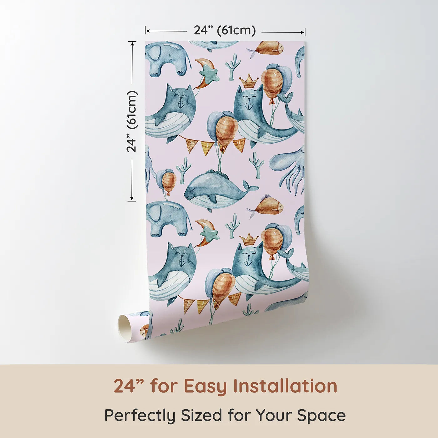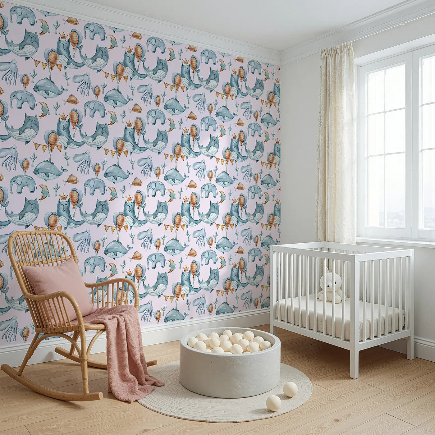 This sweet girls wallpaper showcases a magical parade of watercolor whales and animal friends floating with balloons on a warm blush pink sky. Crowned whales, happy elephants, and cheerful fish create a charming scene that inspires wonder and imagination.