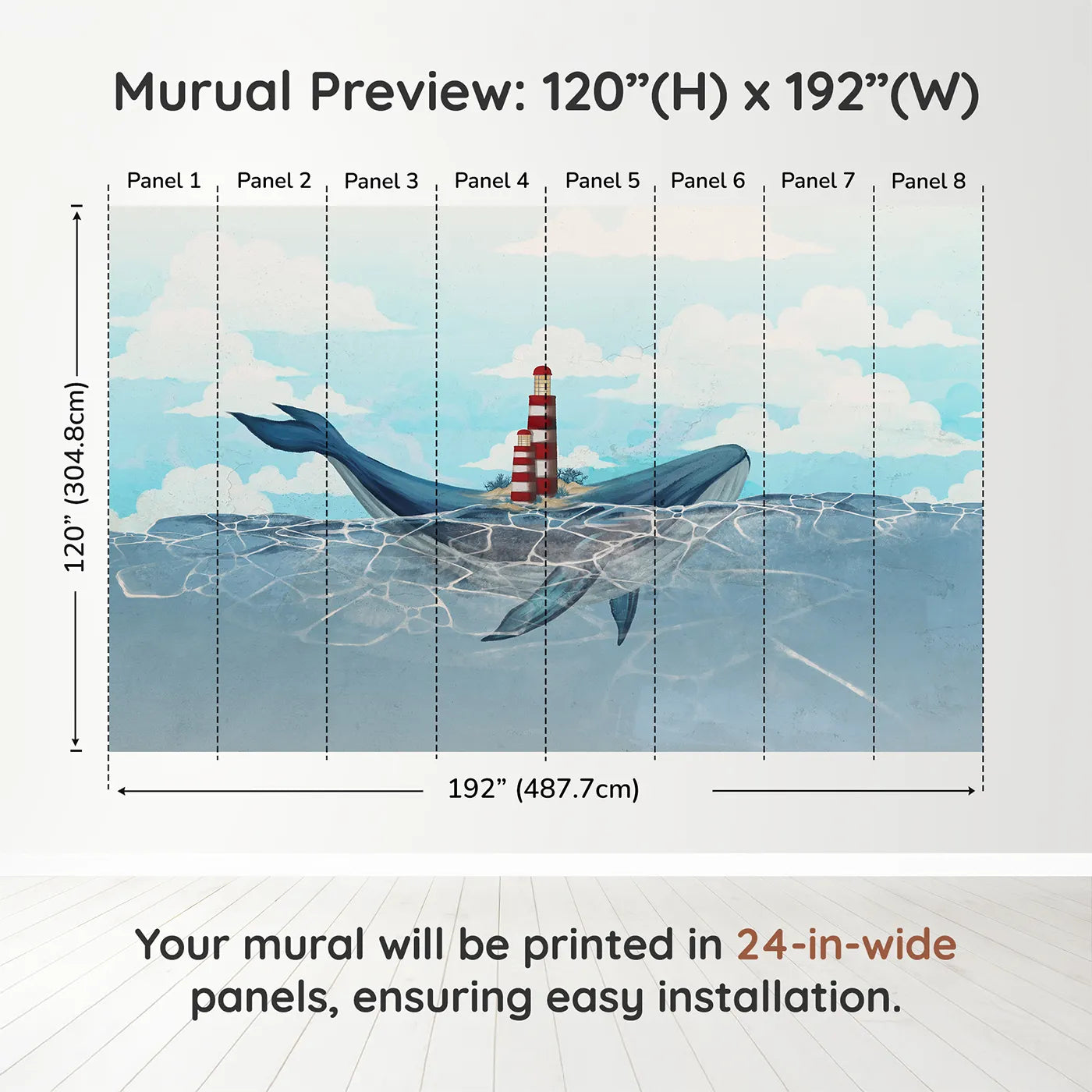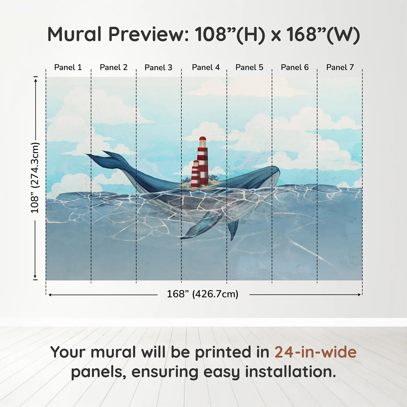 This imaginative and artistic wall mural features a majestic whale with a tiny island and lighthouse on its back, swimming through a beautiful blue sea. The unique, storybook-style illustration creates a sense of wonder and adventure, perfect for a creative child's room or playroom.