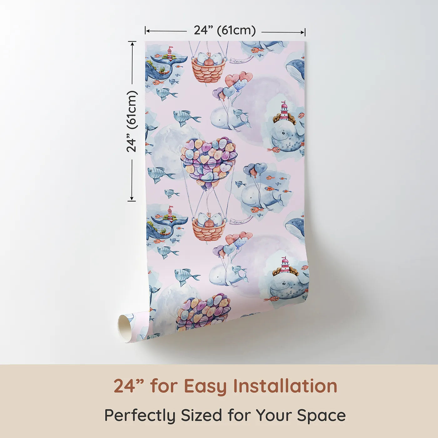 This sweet girls wallpaper showcases a magical scene of watercolor whales and hippos in hot air balloons against a warm blush pink sky. With heart-shaped balloons and floating lighthouses, this design creates a cozy and imaginative space that inspires wonder and love.
