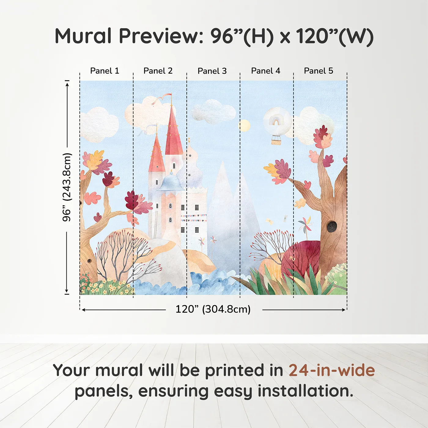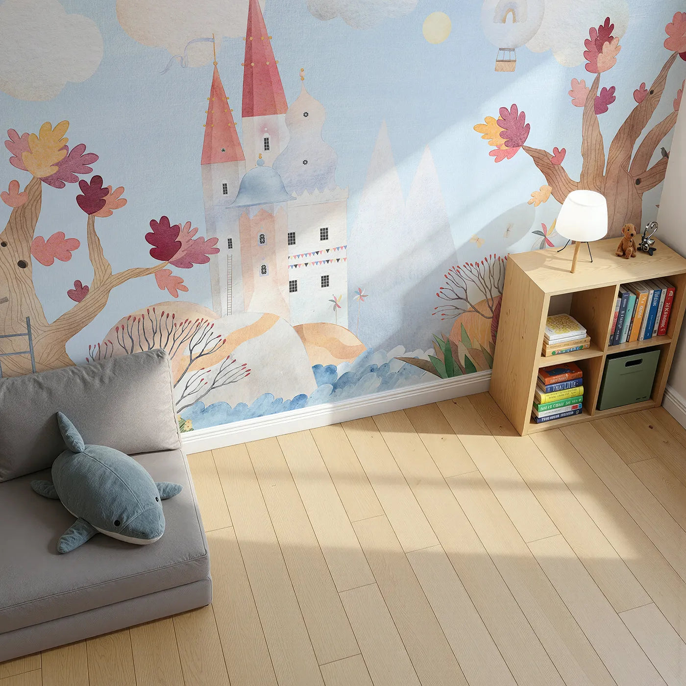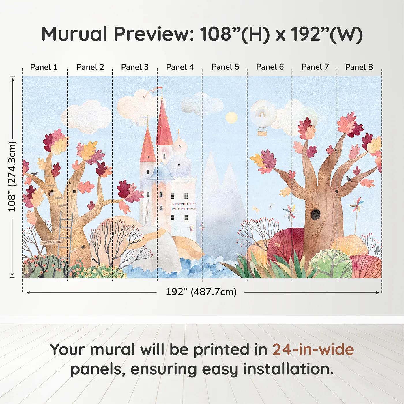 This charming and imaginative wall mural features a whimsical castle nestled among quirky, colorful autumn trees. A little hot air balloon floats in the sky, inviting your child to dream up stories about who lives in this magical kingdom. The beautiful watercolor style is full of warmth and playful details.