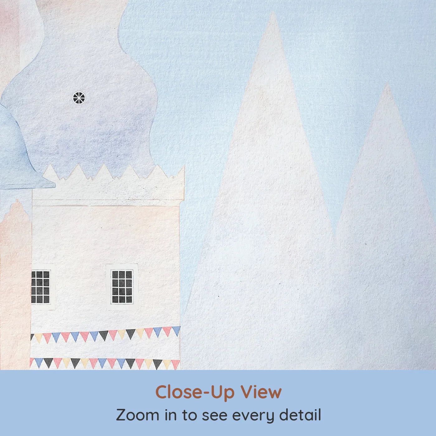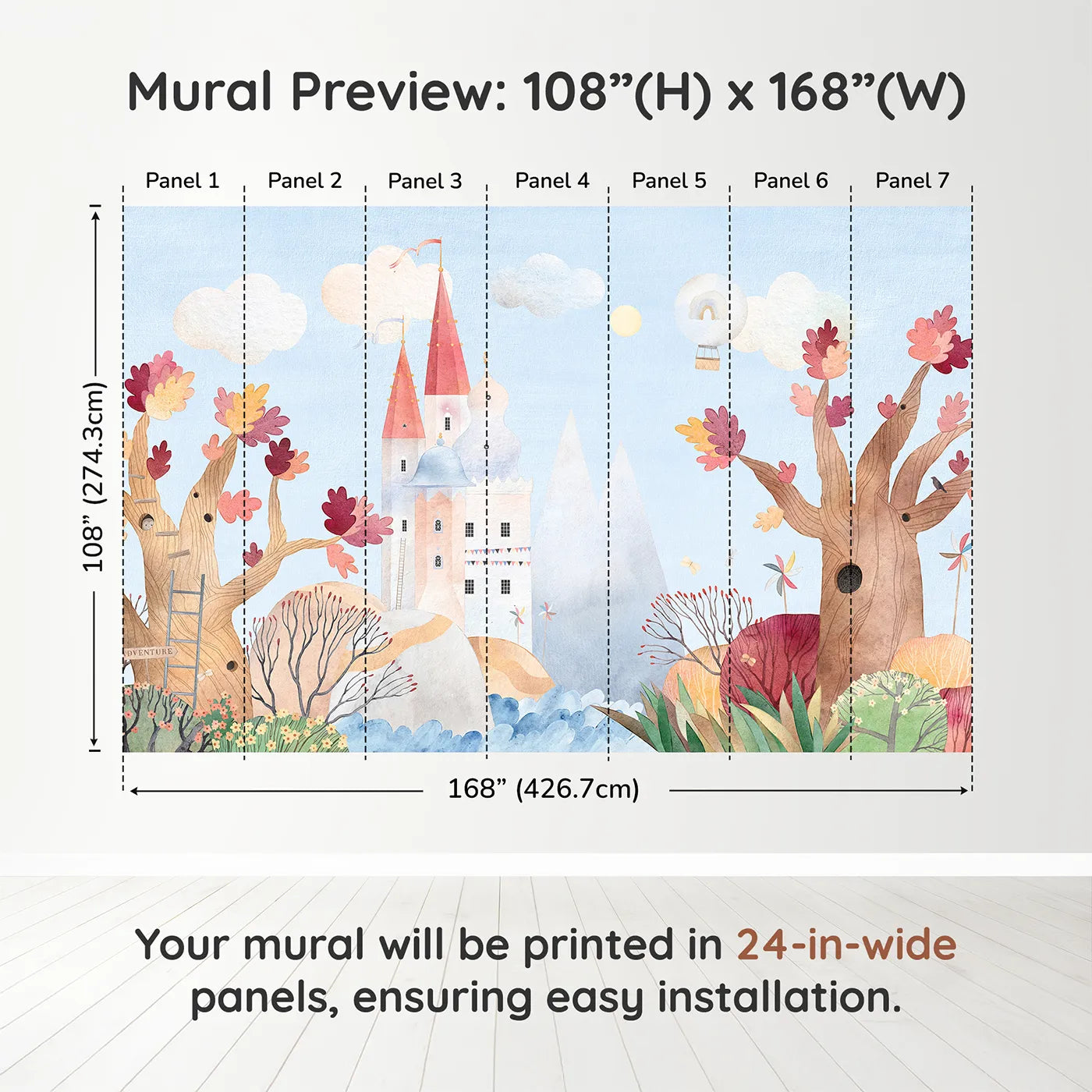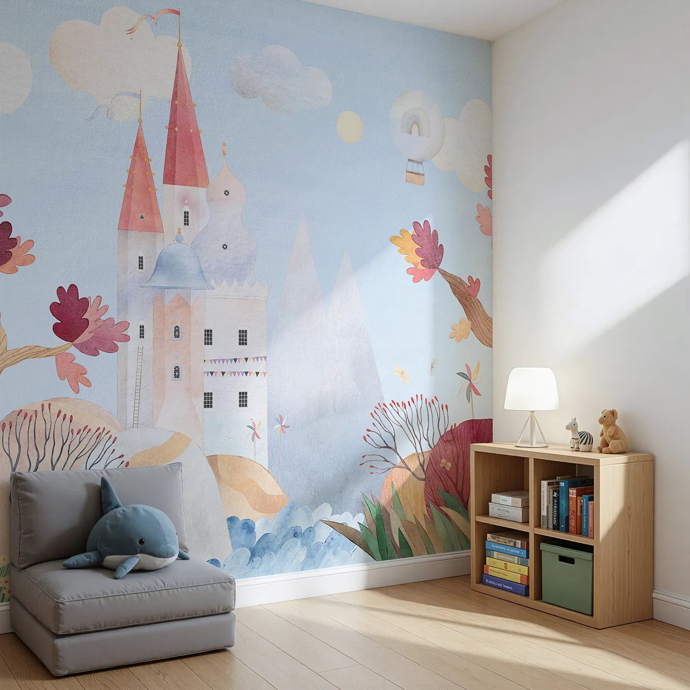 This charming and imaginative wall mural features a whimsical castle nestled among quirky, colorful autumn trees. A little hot air balloon floats in the sky, inviting your child to dream up stories about who lives in this magical kingdom. The beautiful watercolor style is full of warmth and playful details.