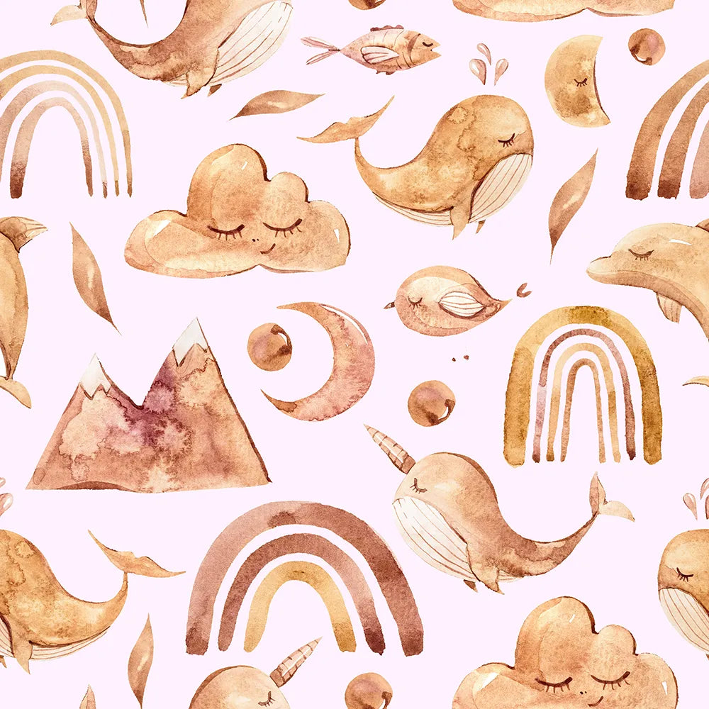 This charming girls wallpaper is a whimsical celebration of our wonderful world on a blush pink background. It features a playful mix of cute animals, smiling mountains, sleepy clouds, and earthy rainbows, all painted in a soft watercolor style. This imaginative design is perfect for a nursery or playroom.