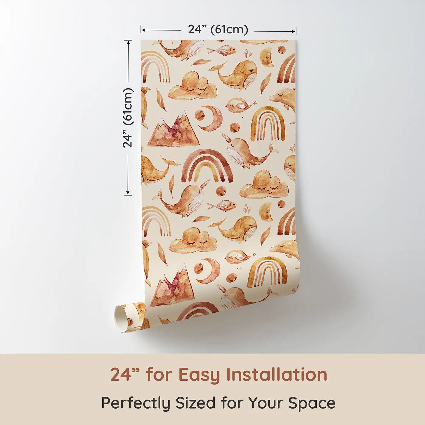 This charming kids wallpaper is a whimsical celebration of our wonderful world on a warm cream background. It features a playful mix of cute animals, smiling mountains, sleepy clouds, and earthy rainbows, all painted in a soft watercolor style. This imaginative design is perfect for a nursery or playroom.