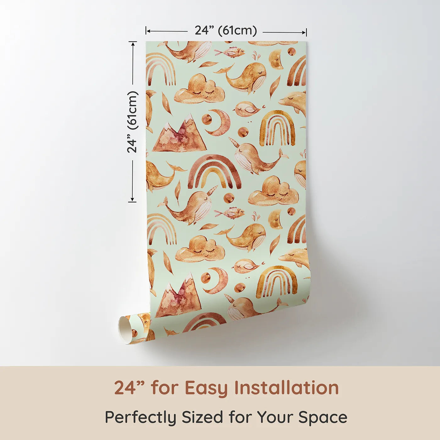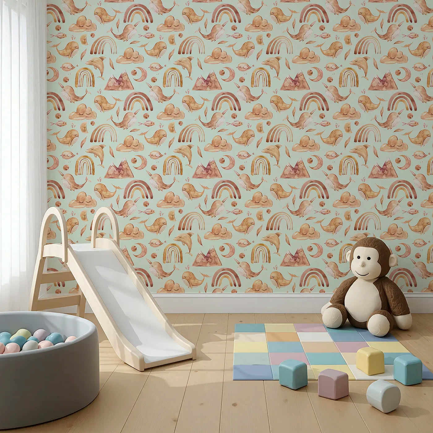 This charming kids wallpaper is a whimsical celebration of our wonderful world on a fresh mint green background. It features a playful mix of cute animals, smiling mountains, sleepy clouds, and earthy rainbows, all painted in a soft watercolor style. This imaginative design is perfect for a nursery or playroom.
