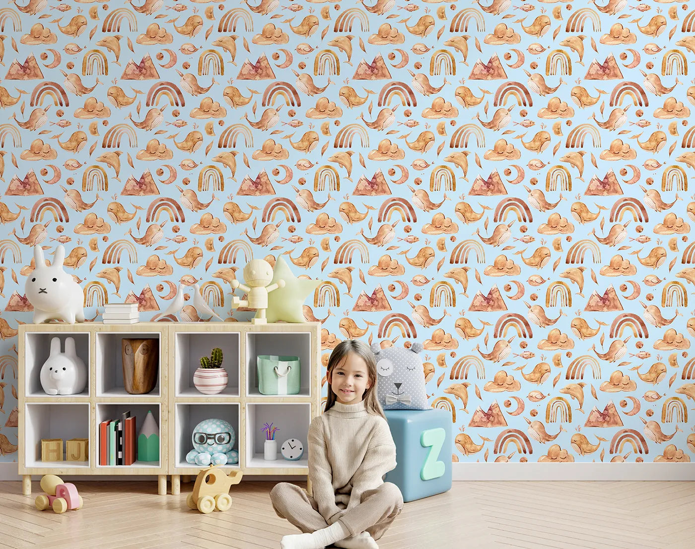This charming kids wallpaper is a whimsical celebration of our wonderful world on a calm sky blue background. It features a playful mix of cute animals, smiling mountains, sleepy clouds, and earthy rainbows, all painted in a soft watercolor style. This imaginative design is perfect for a nursery or playroom.