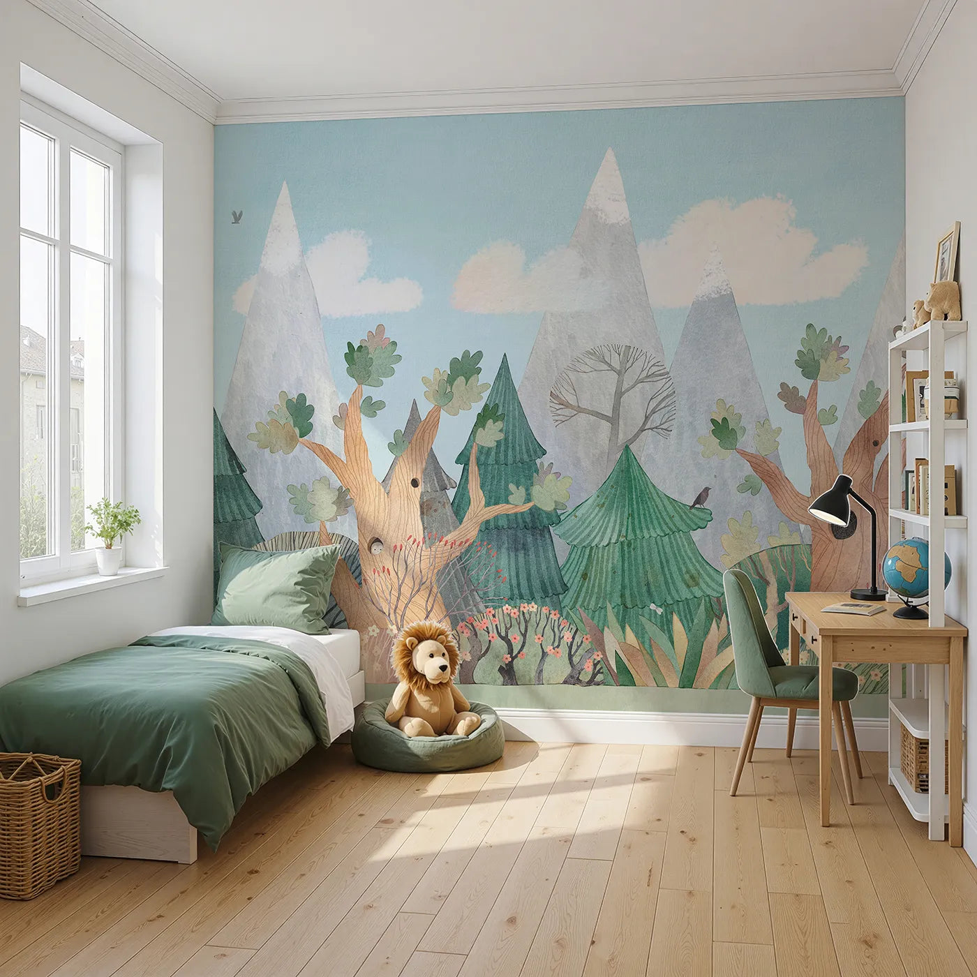 This charming wall mural features a border of whimsical, watercolor trees in a variety of fun shapes and colors. The soft, artistic style creates a playful yet calming atmosphere, perfect for adding a touch of nature to a nursery or playroom without overwhelming the space.
