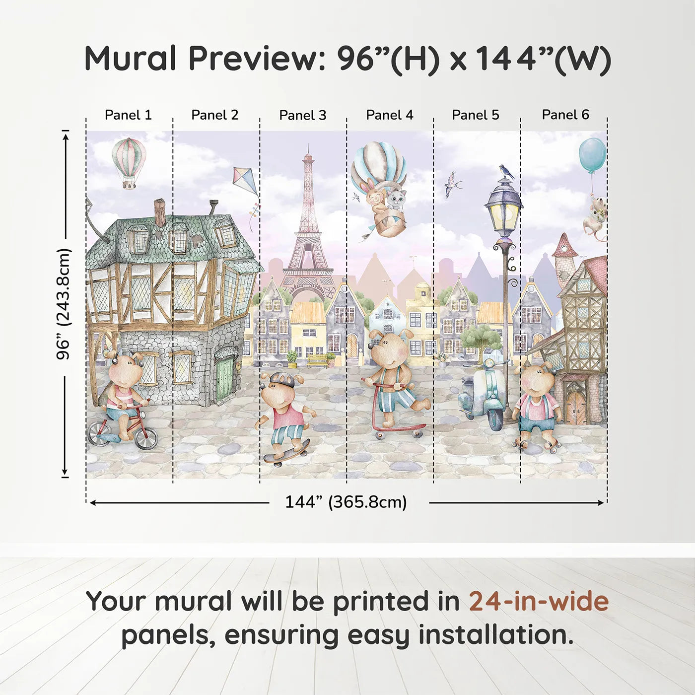 This charming and imaginative wall mural is a sweet Parisian dream. A group of adorable, cartoon dogs ride scooters and bicycles down a cobblestone street, with the Eiffel Tower and classic architecture in the background. The beautiful watercolor style and soft colors create a magical scene.