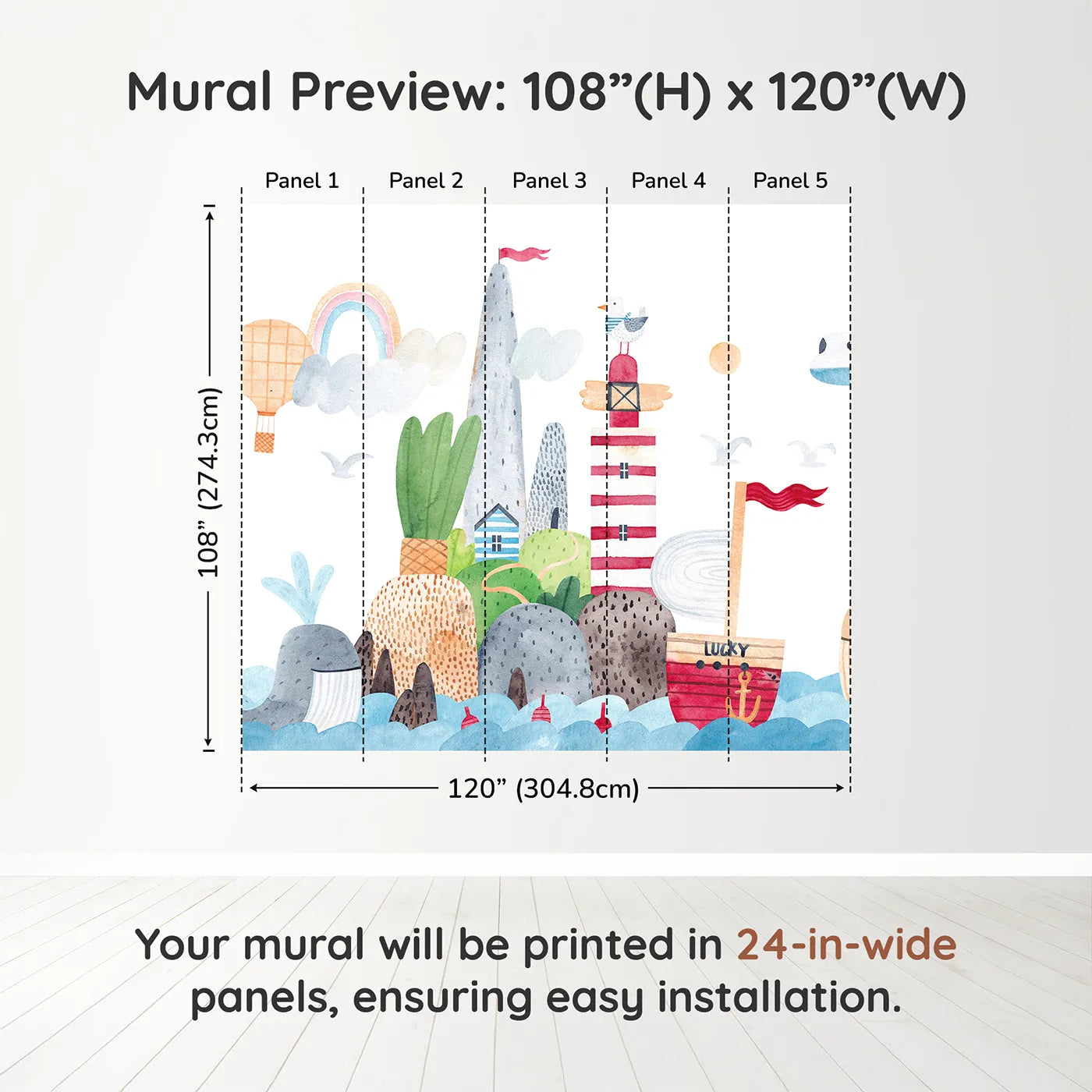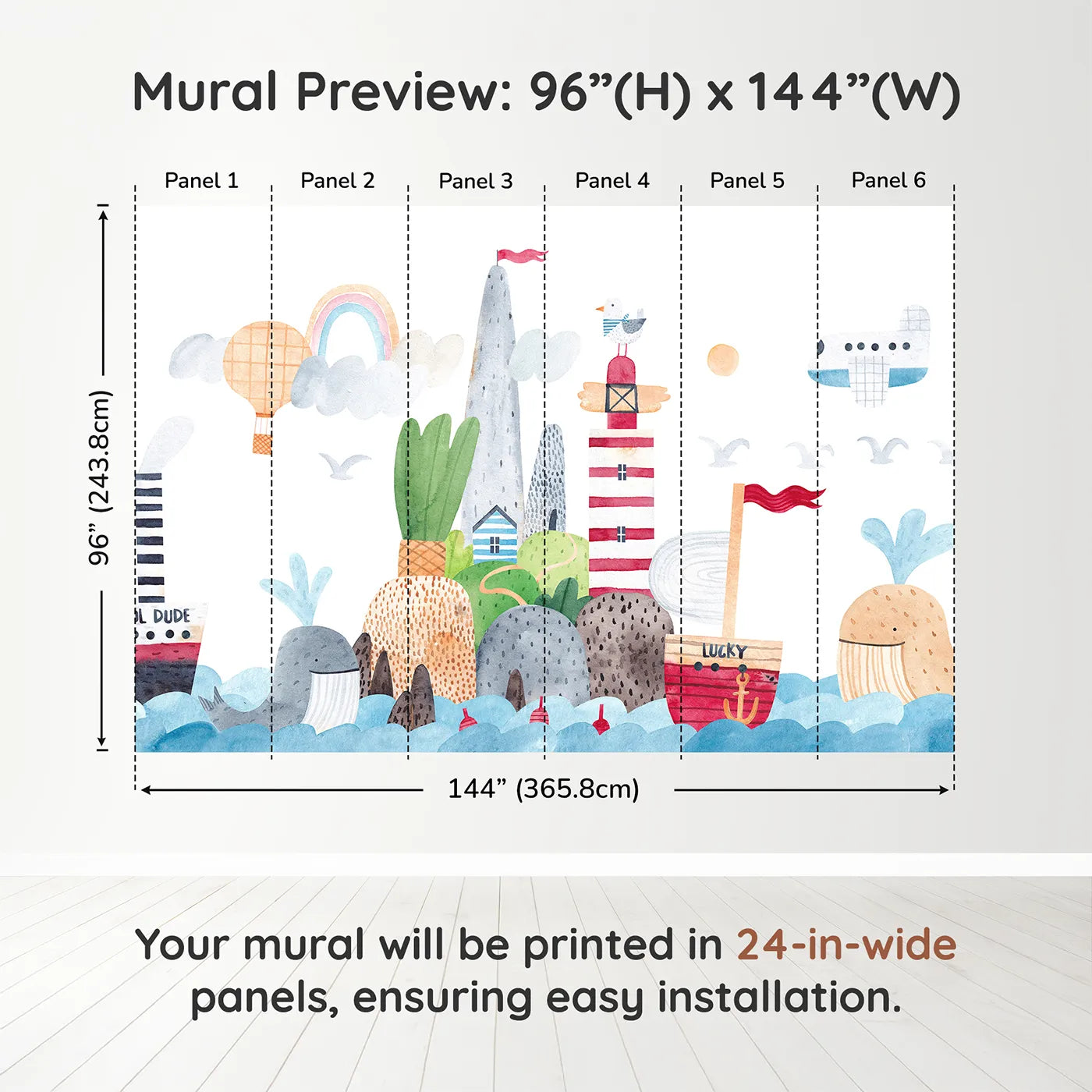 This adorable and whimsical wall mural features a bustling seaside town in a beautiful watercolor style. Friendly whales, a lucky ship, a tall lighthouse, and even an airplane join the scene, which is packed with charming details to discover. It's a perfect design for an imaginative child's playroom or bedroom.