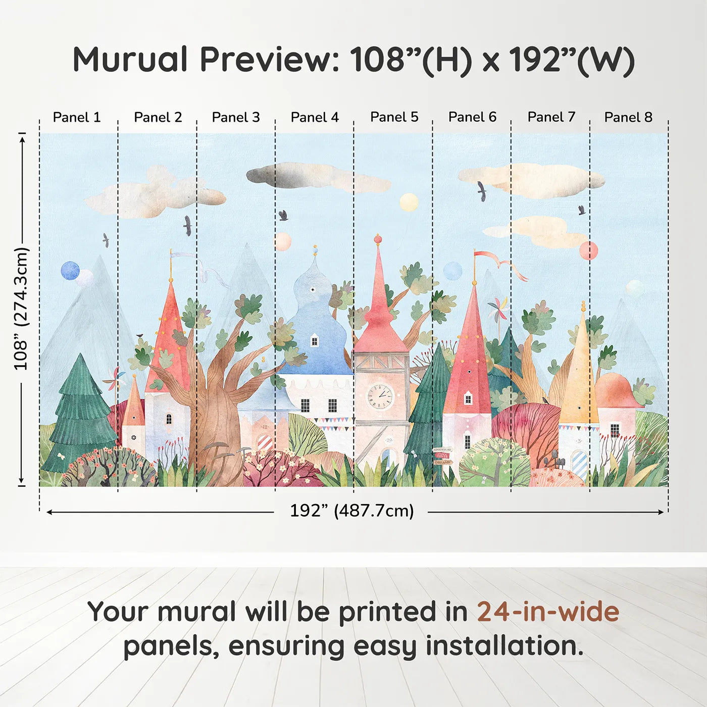 Whimsical Village Wall Mural - A Sweet Street for Happy Daydreams