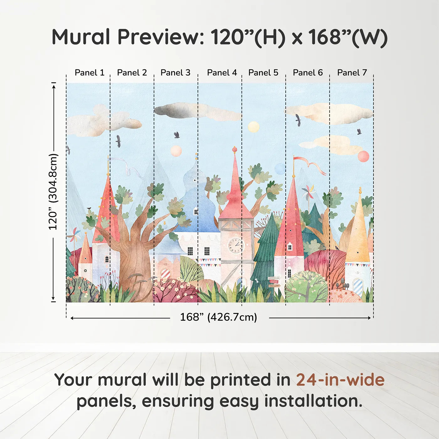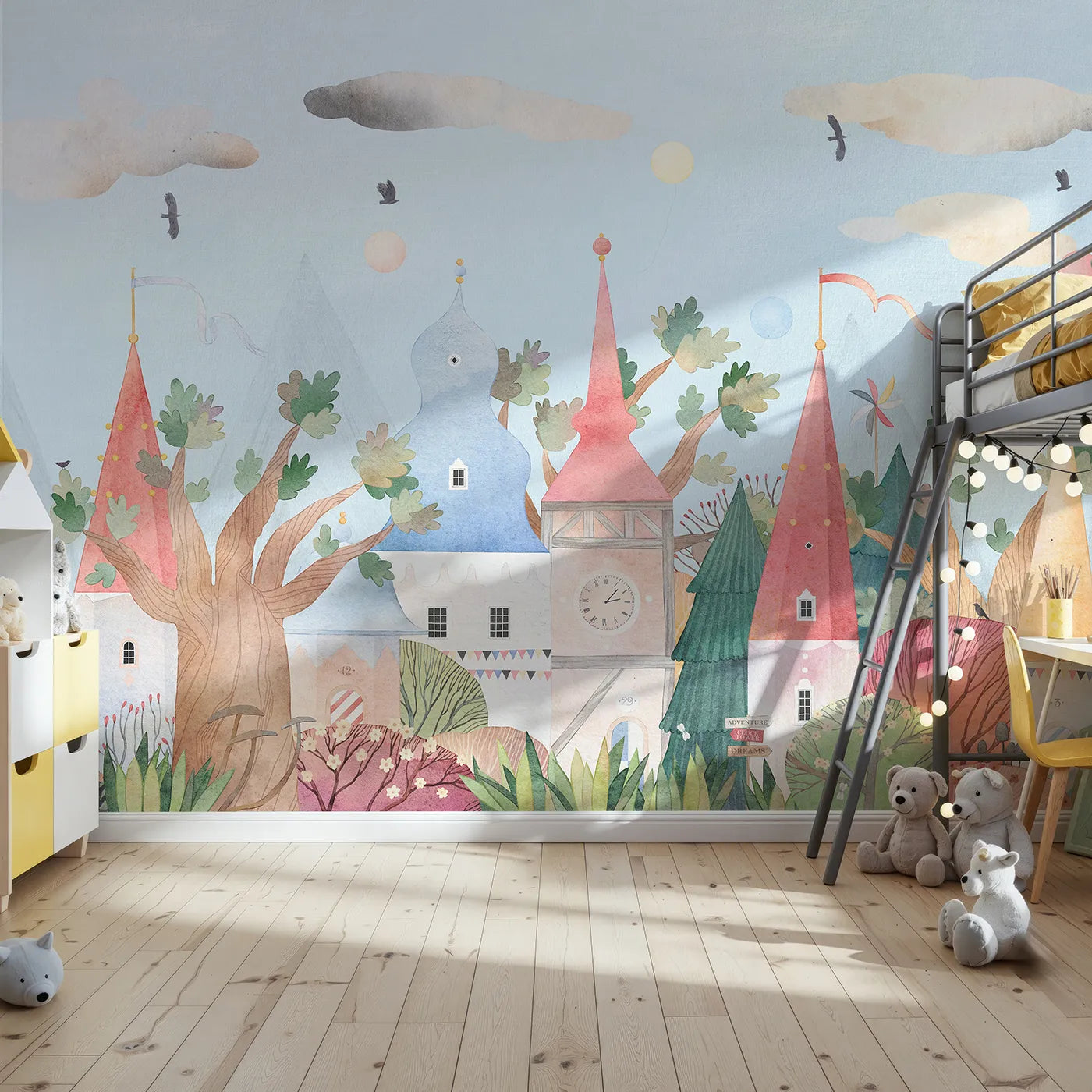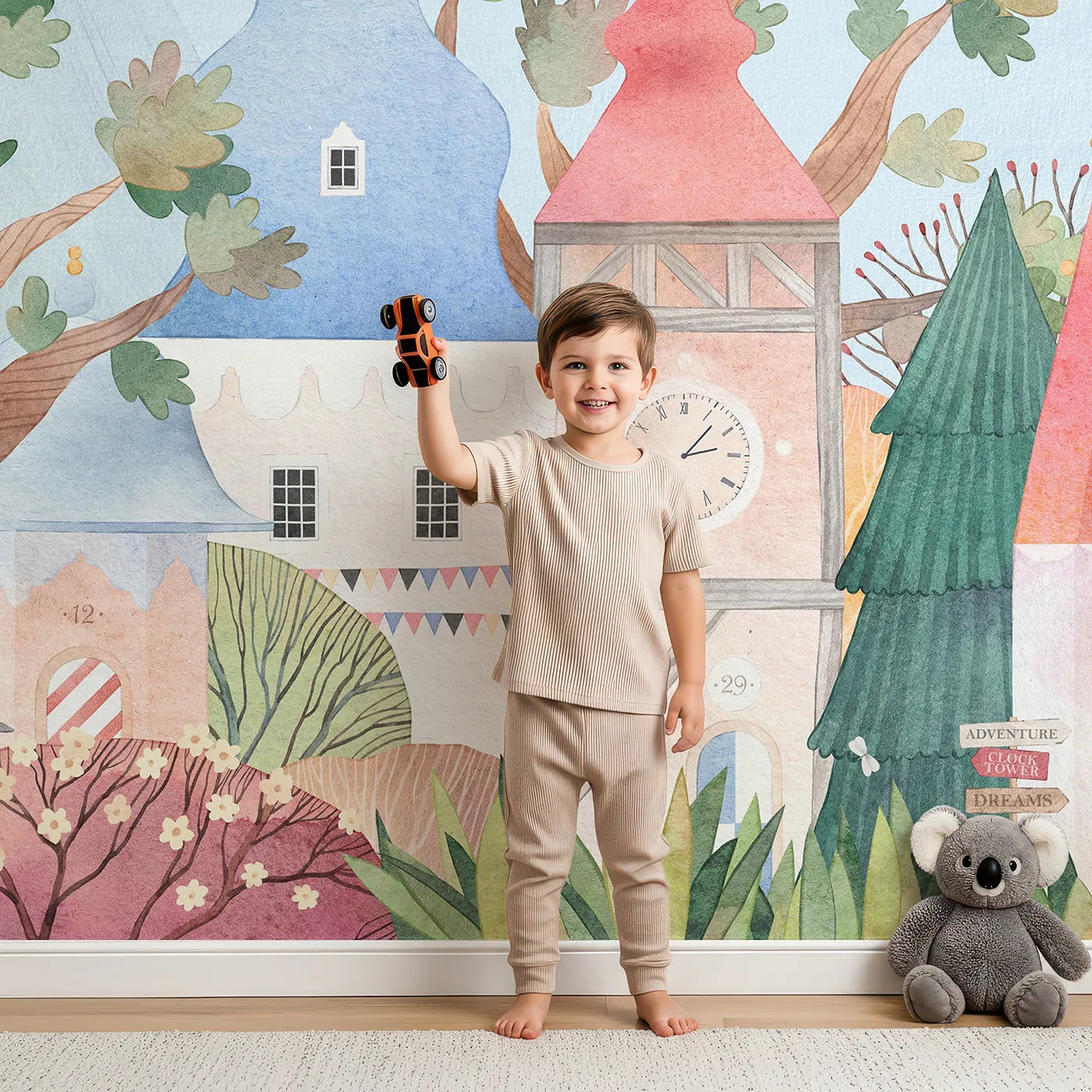 This charming kids wall mural features a row of cozy, watercolor townhouses, each with its own unique personality. With sweet details like a heart-shaped house, festive banners, and little birds, this design creates a comforting and imaginative neighborhood scene perfect for a nursery.