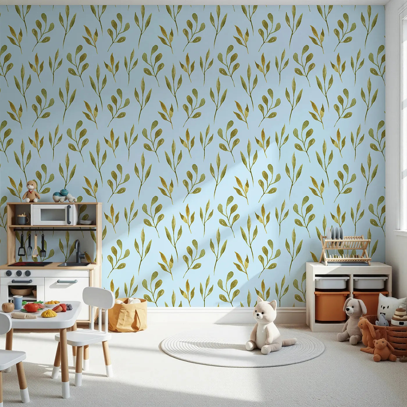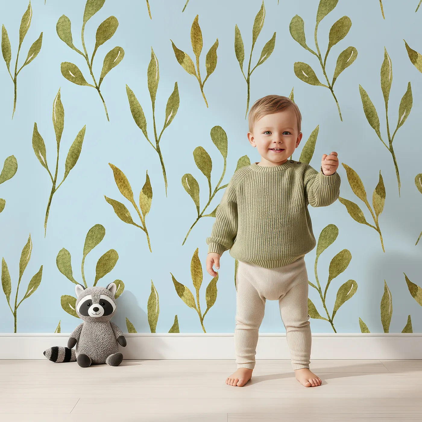 Let them dream big in a room filled with calming, nature-inspired charm. This beautiful botanical wallpaper features whimsical leafy branches in soft greens and beiges, floating on a gentle sky-blue background. Itβs a serene design perfect for a nursery or playroom.