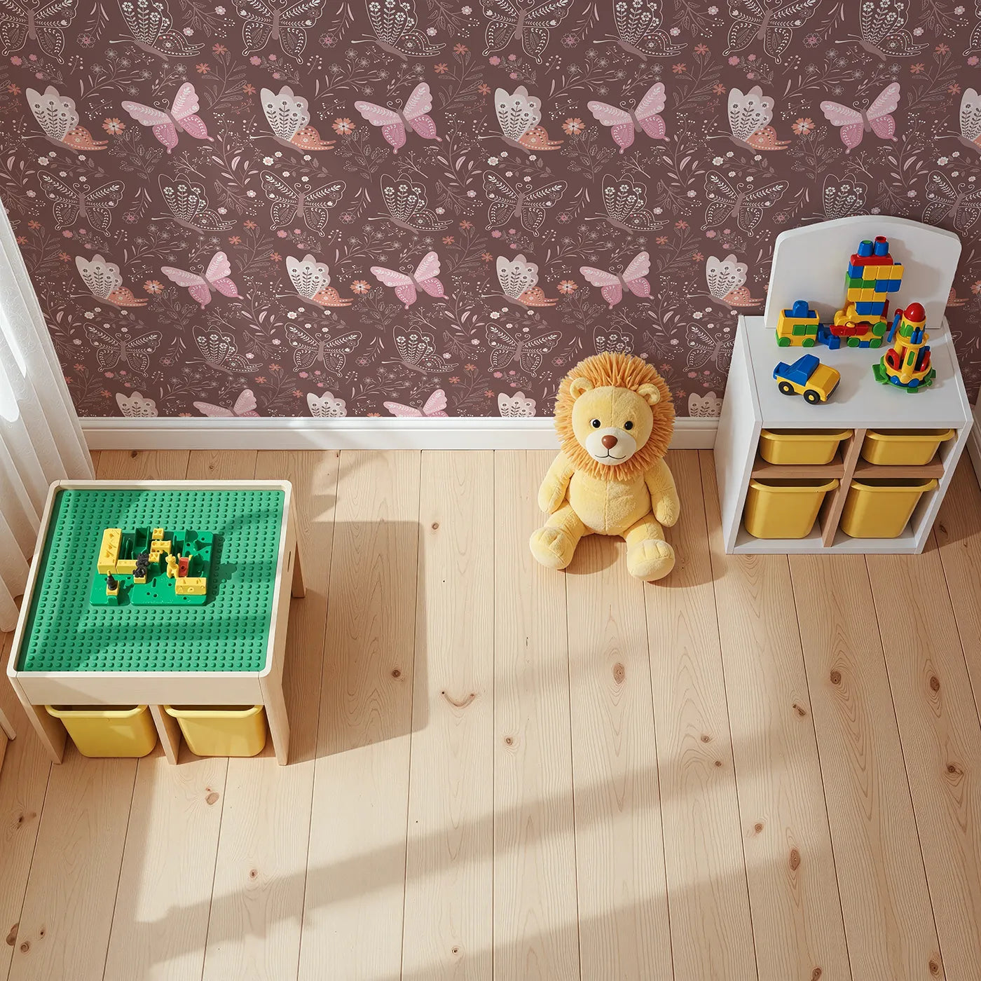 This beautiful girls wallpaper features a stunning pattern of folk-art butterflies surrounded by wildflowers and leaves. The warm, cocoa-rose brown background gives the design an earthy and sophisticated feel, while the pops of pink add a touch of sweetness. Itβs perfect for a room that feels both cozy and magical.