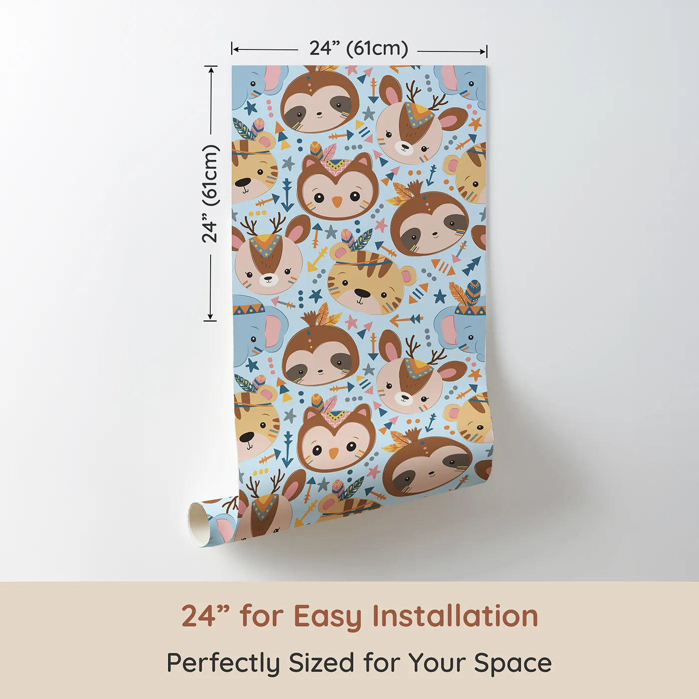 Spark your little one's imagination with this playful animal wallpaper. A cute collection of tribal-inspired animal faces, including a deer, tiger, owl, and elephant, are scattered across a calm, sky-blue background. It's a fun and modern design that creates a perfect backdrop for stories and dreams.