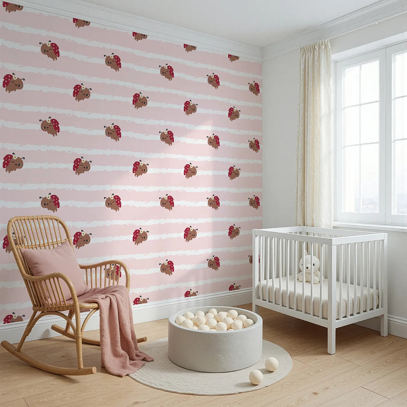 This sweet kids wallpaper is sprinkled with smiling ladybugs among gentle botanicals. The soft pink background and playful pattern make it a perfect choice for a nursery, creating a warm and cheerful atmosphere that grows with your little one.