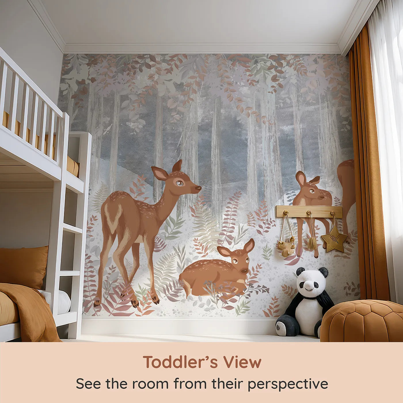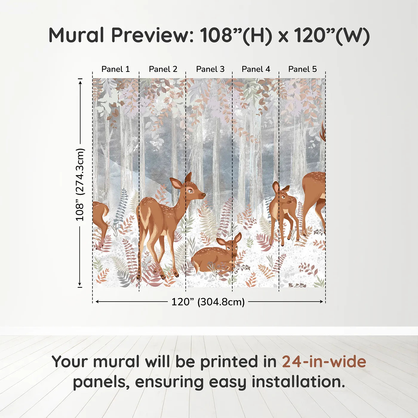 This charming woodland wall mural captures a sweet, peaceful moment in a winter forest. A stag and his family of deer are gathered in a snowy landscape of stylized trees and foliage. The soft, gentle color palette creates a warm and reassuring atmosphere perfect for a nursery.