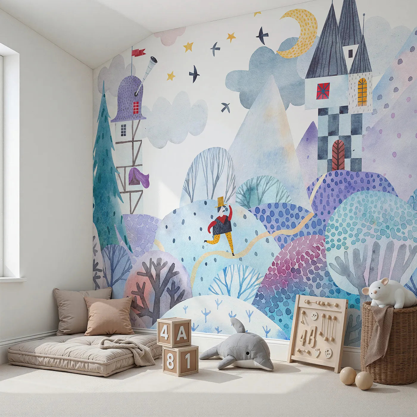 This enchanting wall mural depicts a magical fairytale castle nestled in a snowy winter forest. The beautiful, painterly style and sparkling details create a dreamy and adventurous atmosphere, perfect for a child's room with a love for fairytales and winter magic.