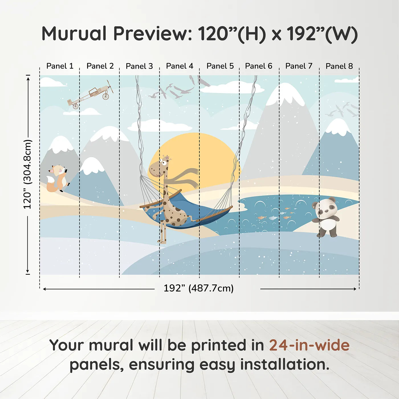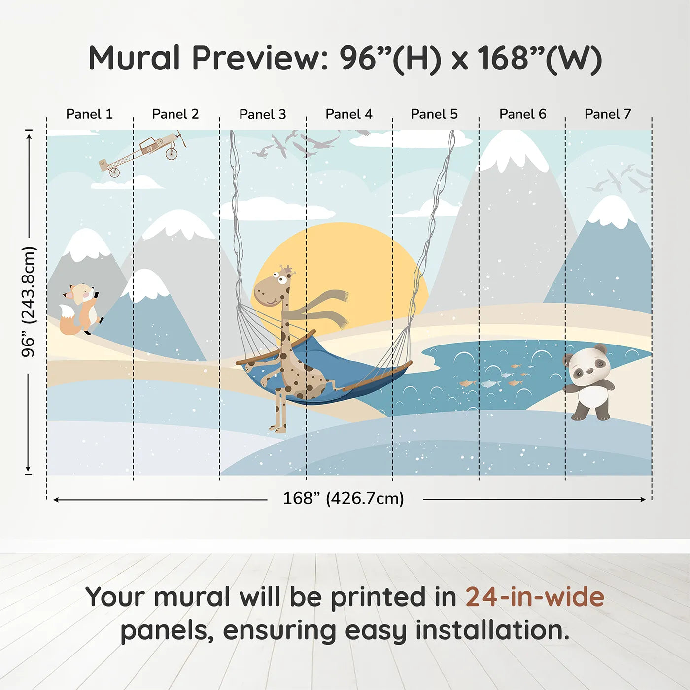 This charming and imaginative wall mural is full of sweet fun! A giraffe relaxes in a hammock while a panda and fox play in a snowy, mountainous landscape. A vintage airplane flies overhead, adding a touch of adventure to this cozy winter scene.