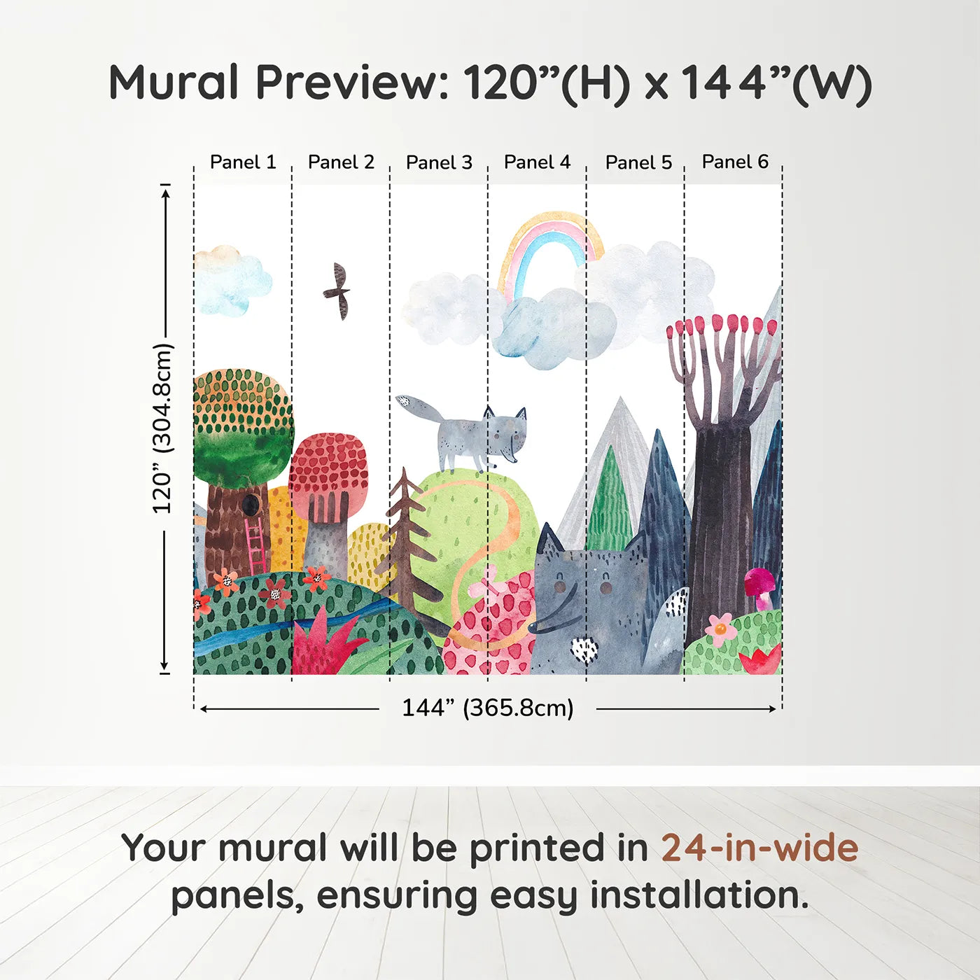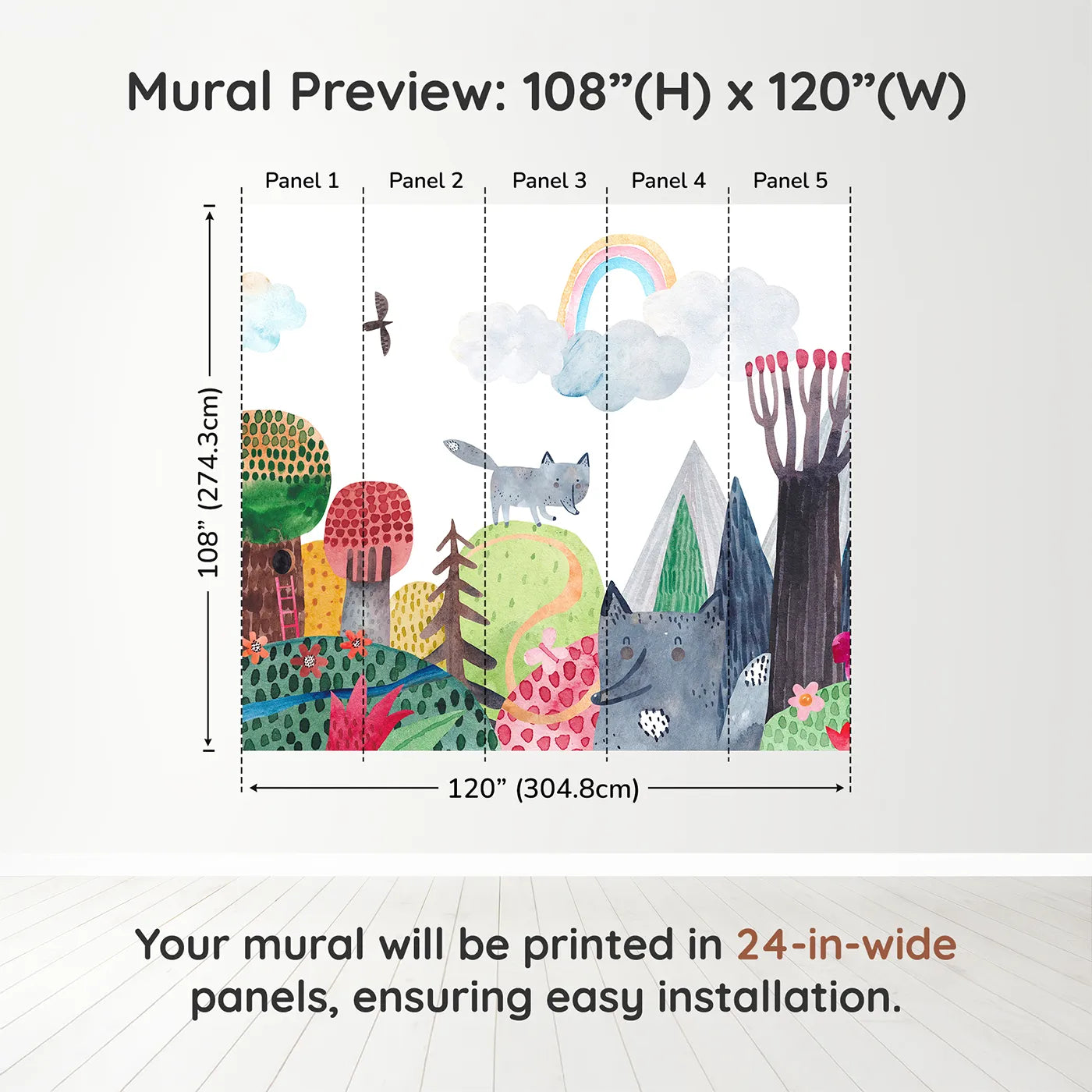 Wolf Mountain Rainbow Wall Mural - A Whimsical Woodland Full of Color and Charm