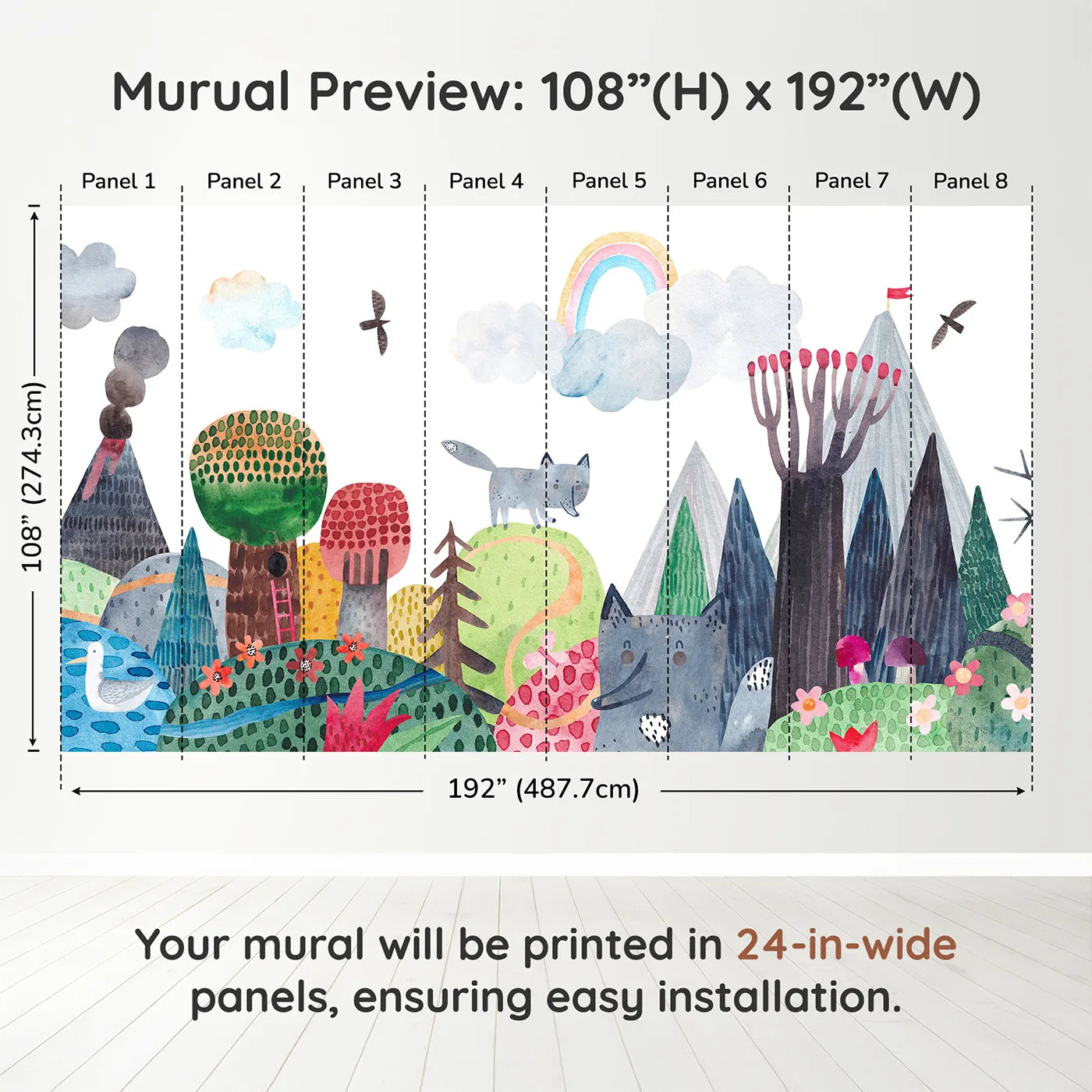 This enchanting and artistic wall mural depicts a whimsical mountain landscape in a beautiful watercolor style. A friendly wolf stands on a hill, overlooking a vibrant forest with a gentle rainbow in the sky. It’s a magical scene, perfect for sparking imaginative stories in a creative child's room.