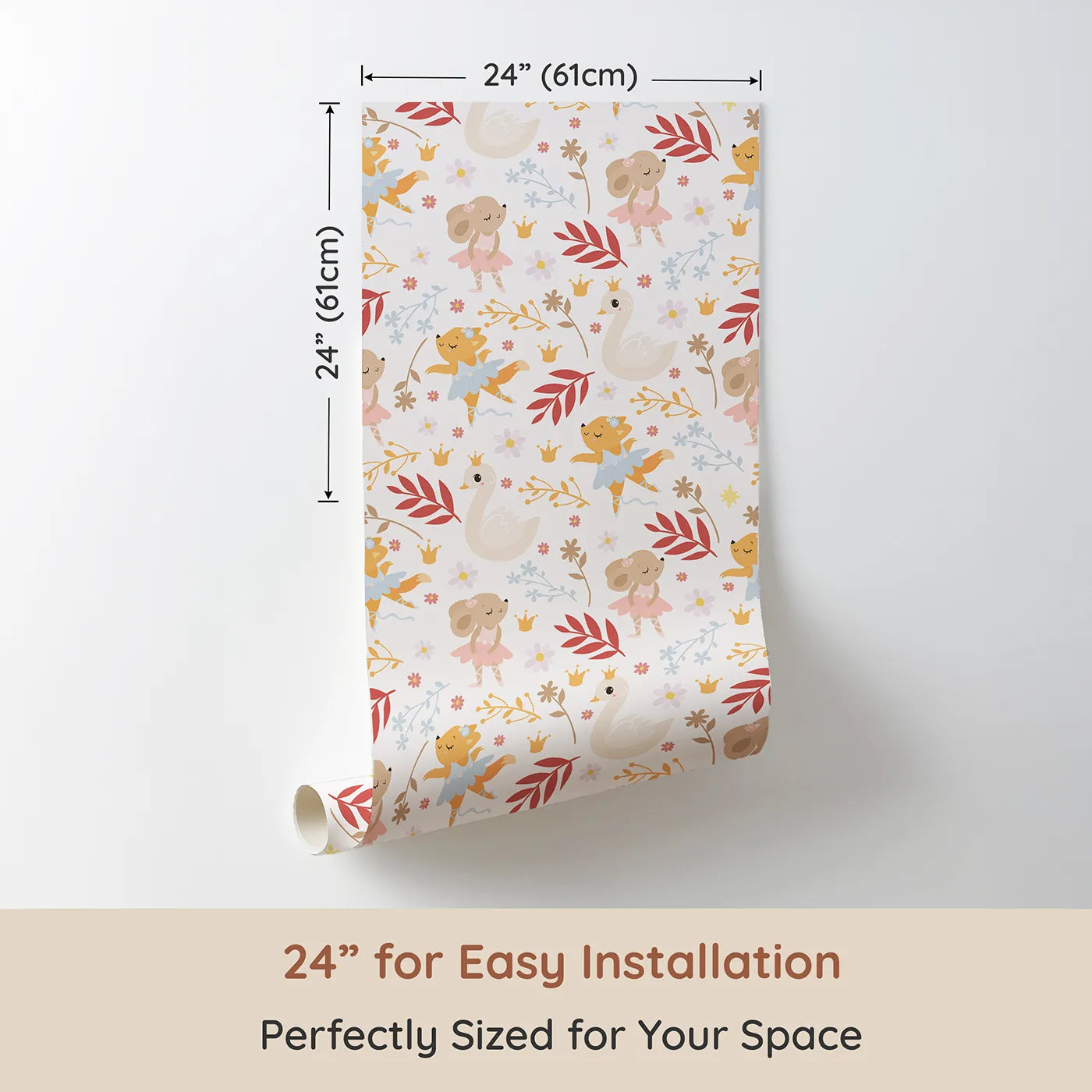 This adorable girls wallpaper features sweet woodland animals like foxes, swans, and mice, dressed in tutus and dancing gracefully. The soft petal cream background creates a warm and reassuring atmosphere, making it a perfect choice for a nursery or first bedroom.