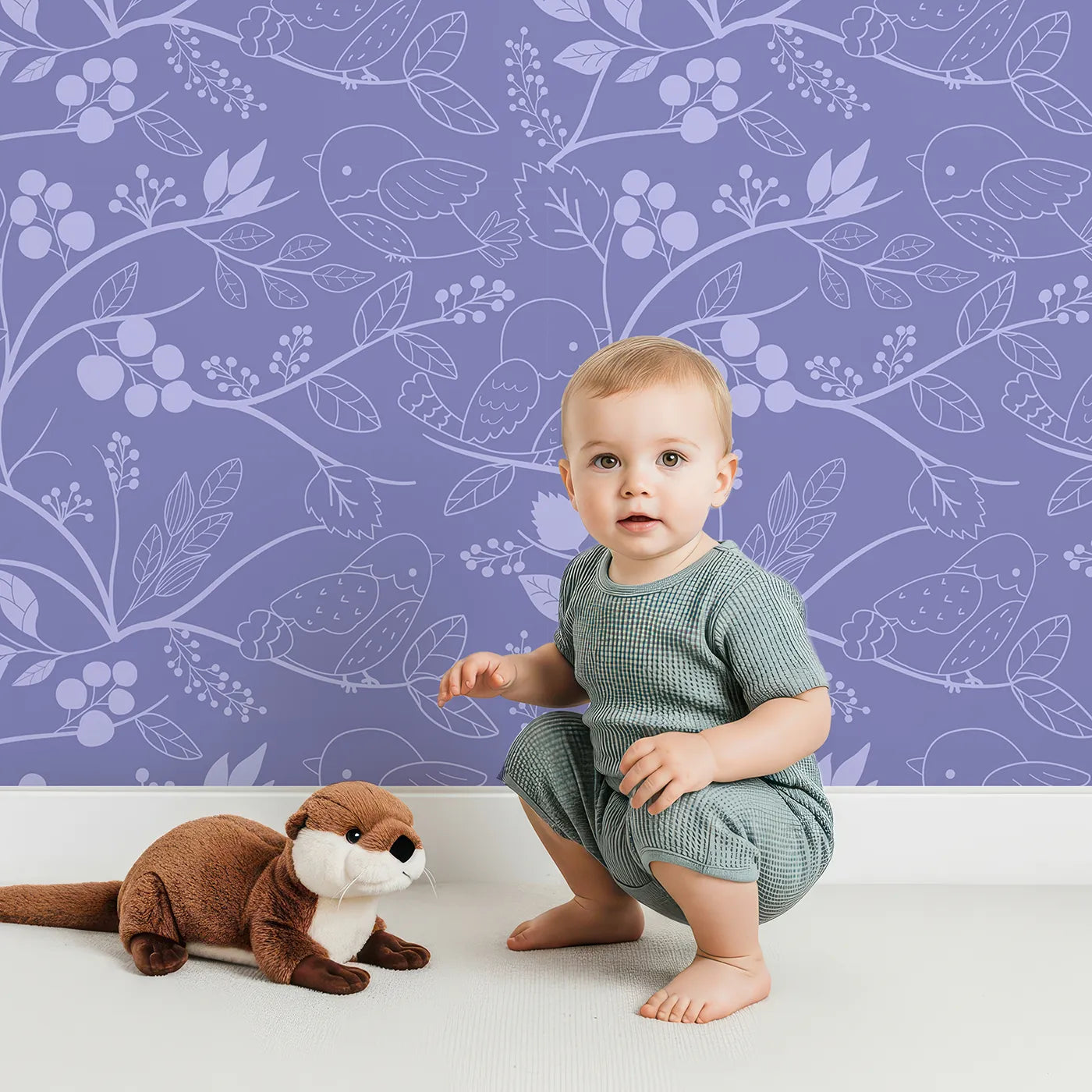 This whimsical girls wallpaper features cute bird silhouettes nestled among delicate branches against a dreamy lavender background. The magical color and sweet design create an enchanting world, perfect for a nursery or bedroom that inspires fairy tales.