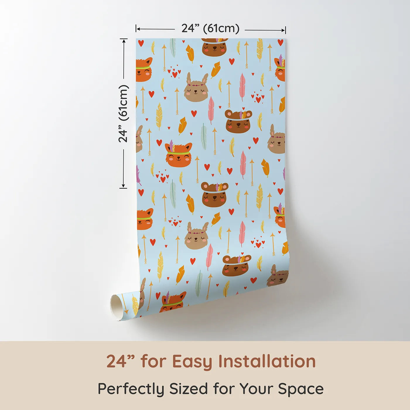 This charming woodland wallpaper showcases sweet animal faces, including a fox and bear, adorned with gentle feathers and surrounded by hearts. The calming sky blue background creates an airy and playful atmosphere, making it a perfect choice for a nursery or playroom filled with imagination and friendship.